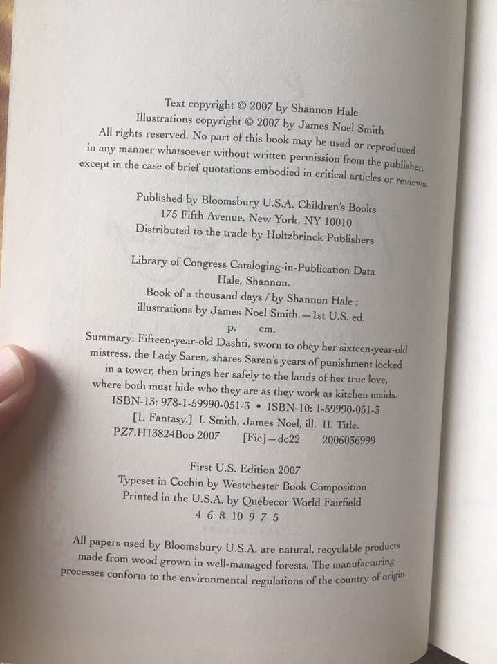Book of a Thousand Days, by Shannon Hale. A reimagining of a little-known Grimm’s fairy tale. First edition hardcover in excellent condition, including dust jacket. 2007, 306 pages. Text only. Cash or Venmo.