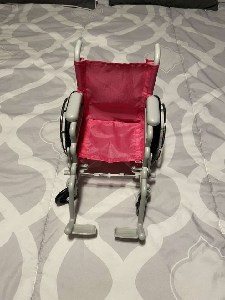 Pink wheelchair for an 18” doll in great condition. Collapsible for easy storage.