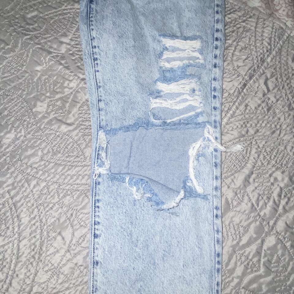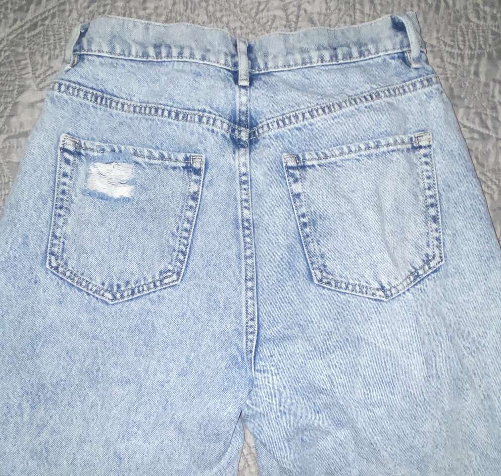 High-rise 12 Straight leg from hip to hem 27 inseam Light blue acid wash 5-pocket body Button fly closure Destruction details Raw cut hem