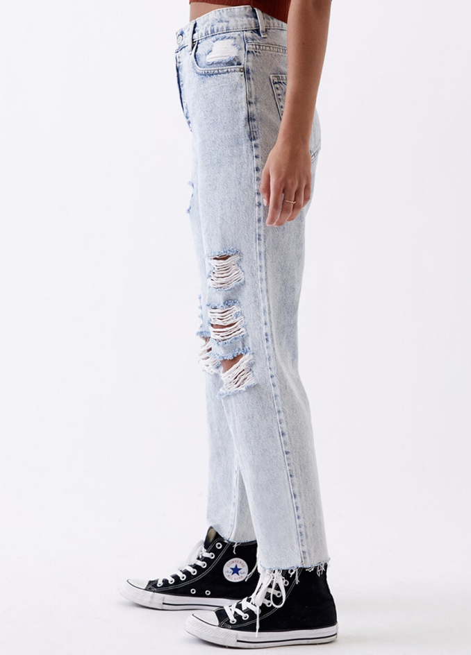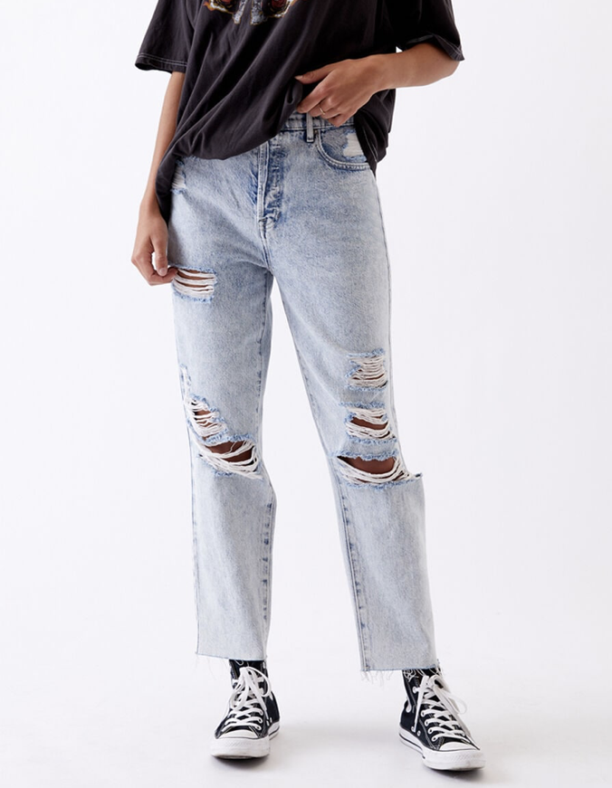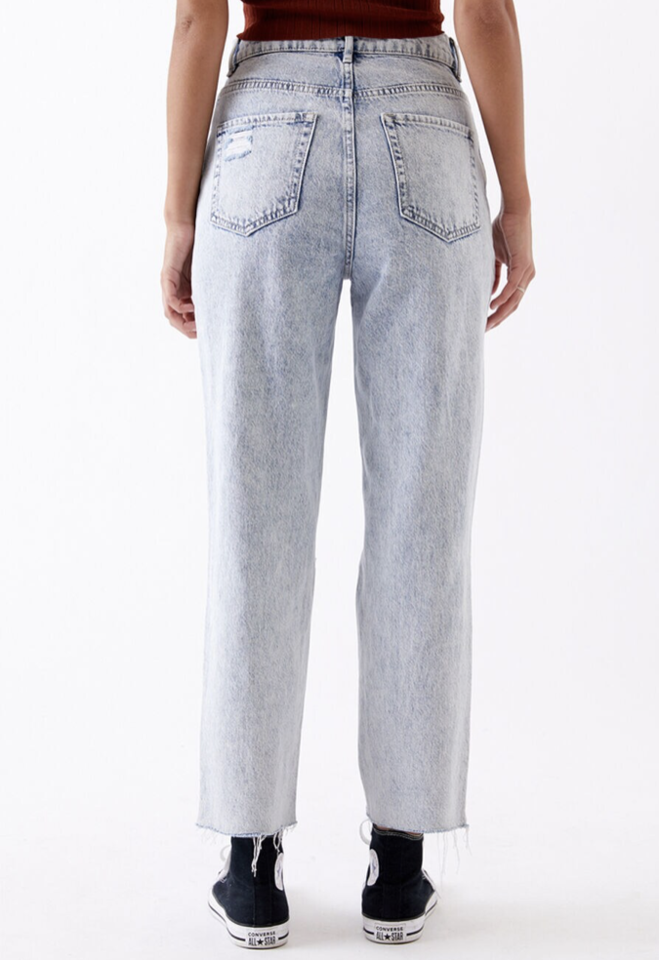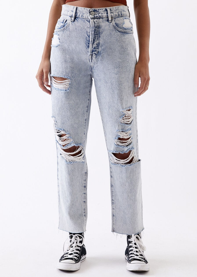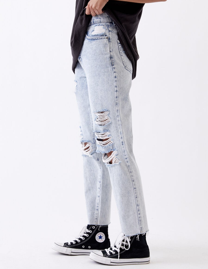 Pacsun offers a comfortable fit in the super cute Light Blue Acid Wash High Waisted Straight Leg Jeans. These hese high-rise jeans are complete with light blue wash, destruction details, raw cut hem, and a straight leg fit.