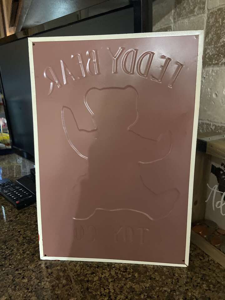 This is a tin vintage reproduction Teddy bear toy Co. sign it has very nice graphics and is very straight and clean Questions please text or message me due to a large volume of Robo calls and scammers I rarely answer my phone