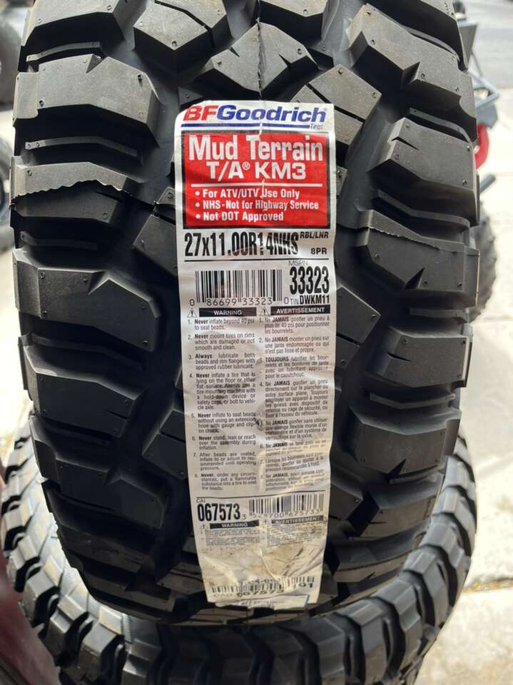 Brand new set of BFG KM3 tires! Tire size is 27x11r14. Call or text 435-257-5346 for a discounted price and ask for Dawson!