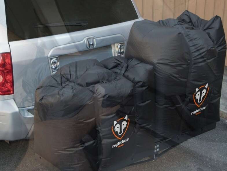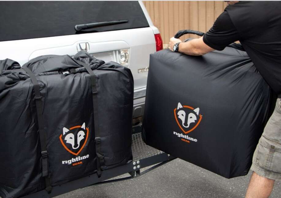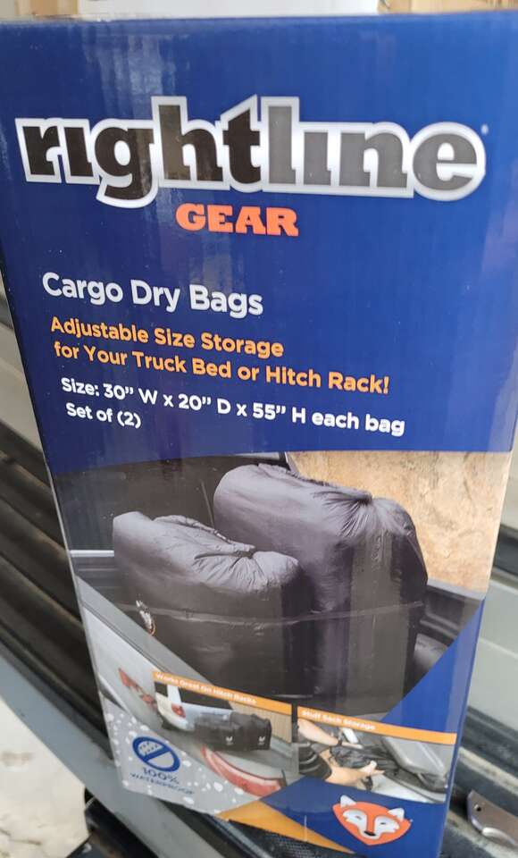 New and still in the box! Rightline Cargo Dry Bags pkg of 2 bags per box. 30"W x 20"D x 55"H. Whether you're hauling suitcases to Grandma's house or hunting gear to deer camp, keep it all dry with the Rightline Gear® Hitch-Rack or Cargo Dry Bags. A unique design allows these hitch-rack bags to hold gear of any shape by simply rolling down the top and fastening with the quick-release buckle. Cut-, tear-, and abrasion-resistant Para-Shield™ construction with taped seams ensures waterproof performance so your gear arrives at its destination in top shape. Heavy-duty straps let you secure the bags to a hitch rack (not included) or the bed of your truck. The Rightline Gear Hitch-Rack or Cargo Dry Bags are small enough to store under a seat with the included stuff sack when you're not using them. Includes 2 bags, 4 tie-down straps, stuff stack, and a setup guide. Imported. Manufacturer model #: 100T6.