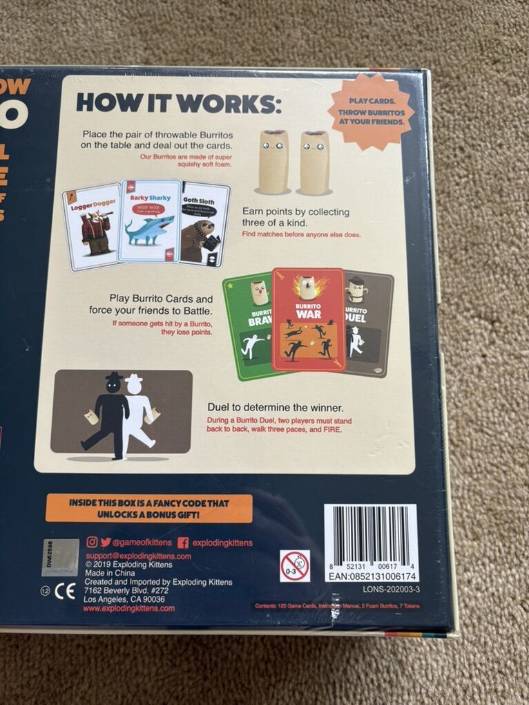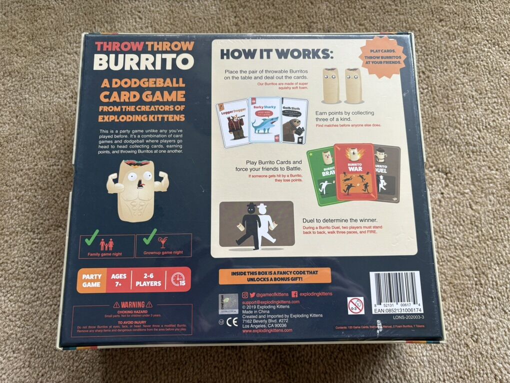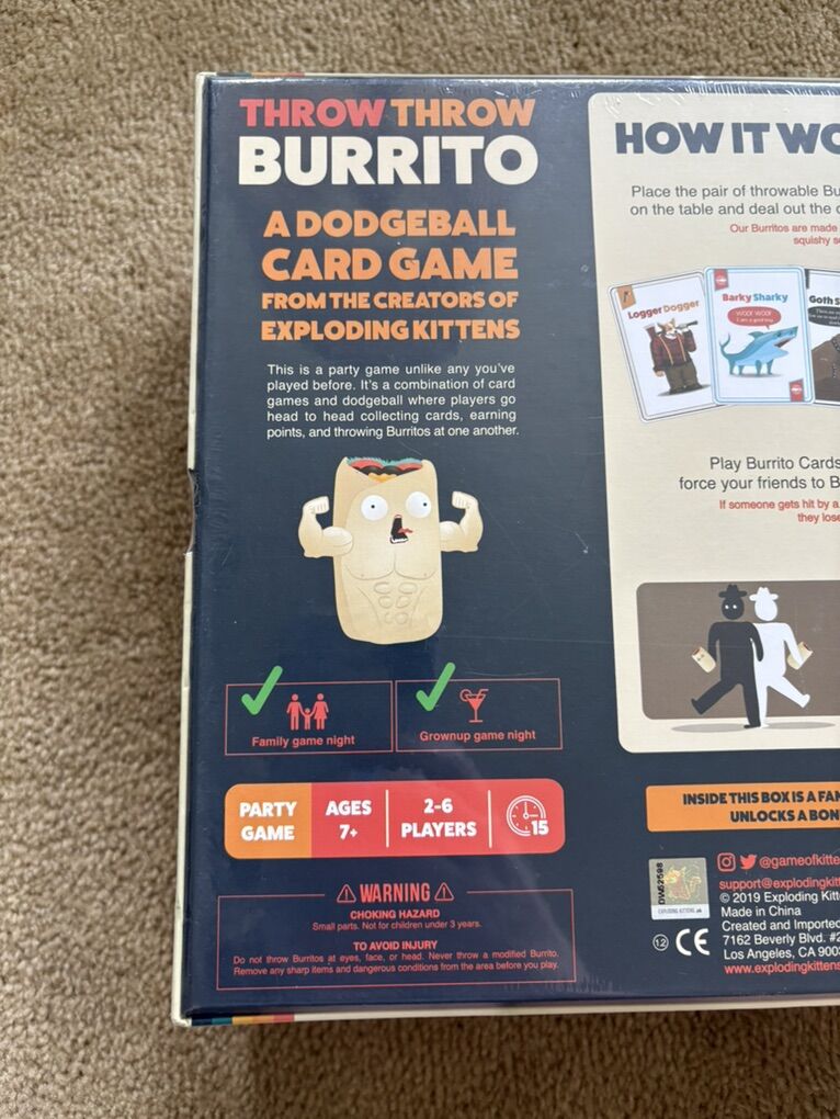 NEW (sealed in plastic) Throw Throw Burrito: A Dodgeball Card Game (original edition) by the creators of Exploding Kittens. “Play cards. Throw burritos at your friends.” 2-6 players, ages 7+. New, unopened condition. Text only. Cash or Venmo.
