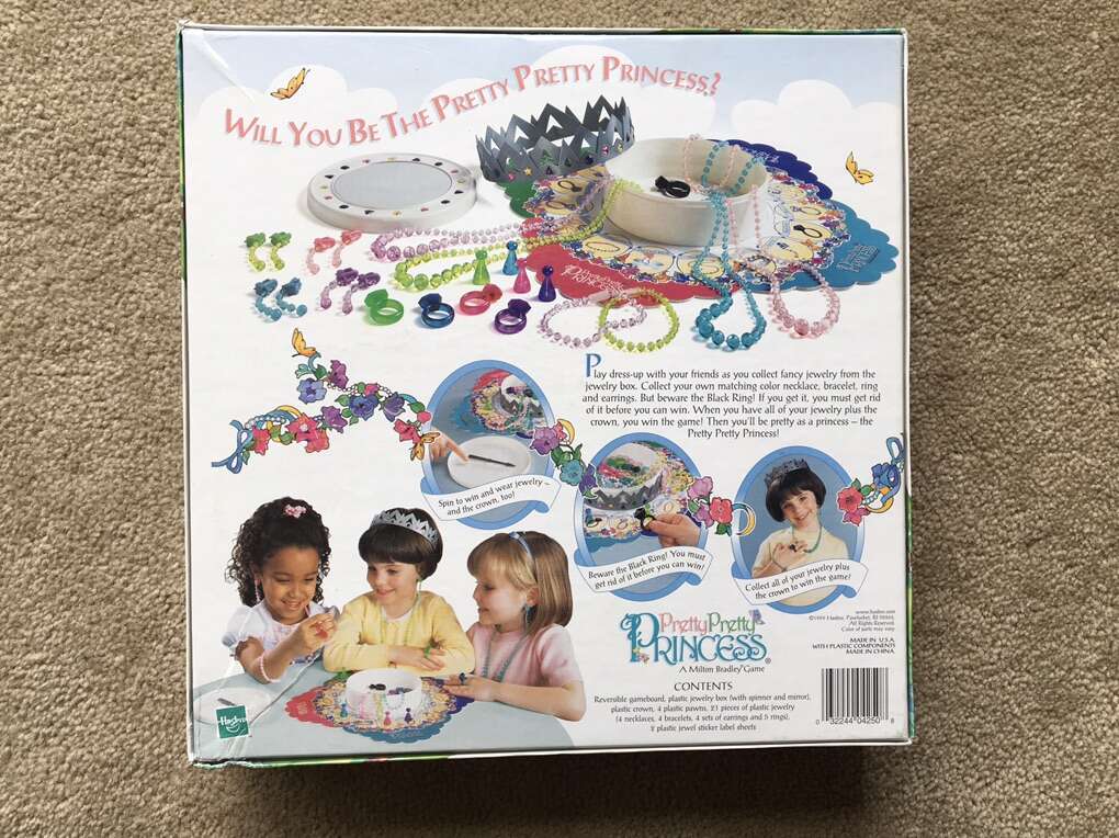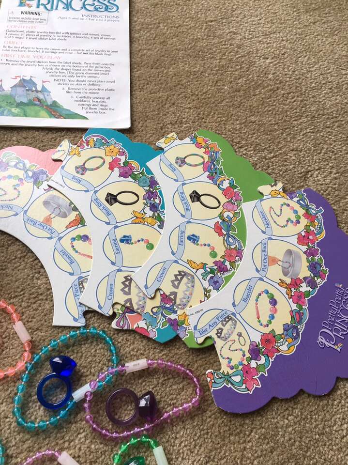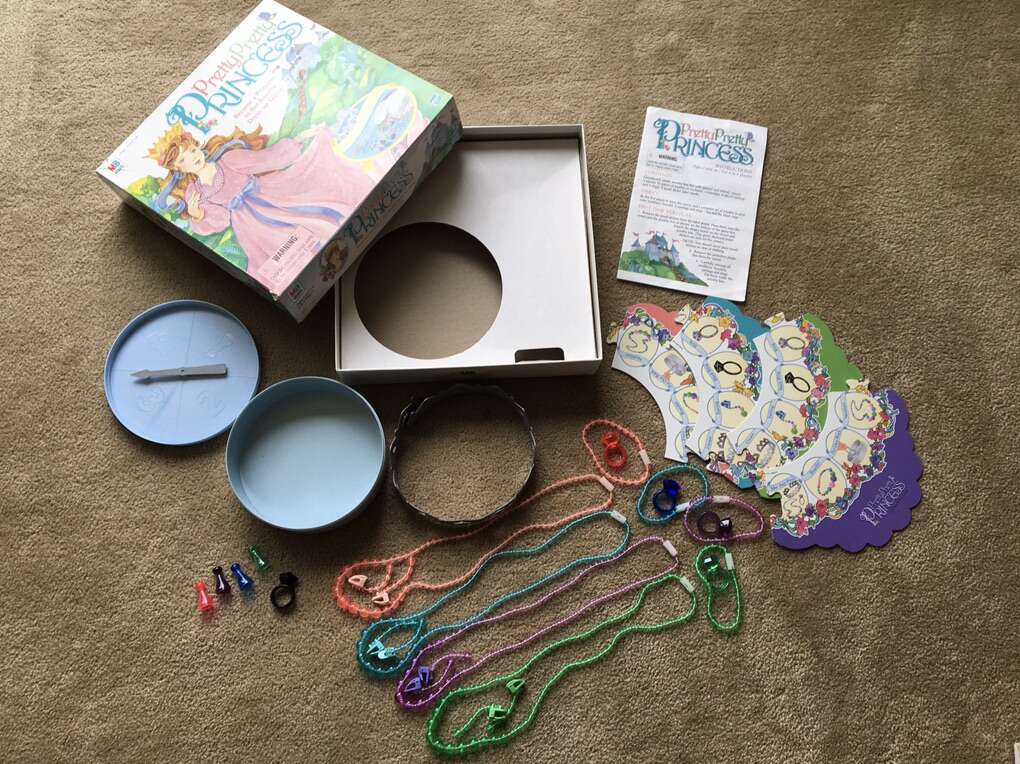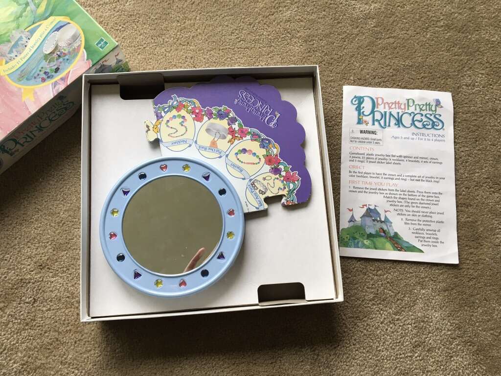 Vintage 1999 Pretty Pretty Princess: Become a Princess in this Jewelry Dress-up Board Game! Complete! No missing parts. Game board, storage box with spinner, 21 pieces of jewelry, crown, and instructions. Box is taped on two corners. Ages 5 and up, 2-4 players. Very good condition. Text only. Cash or Venmo.