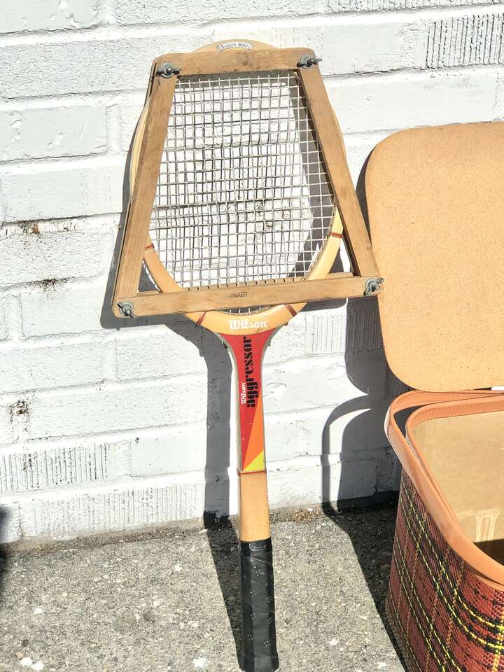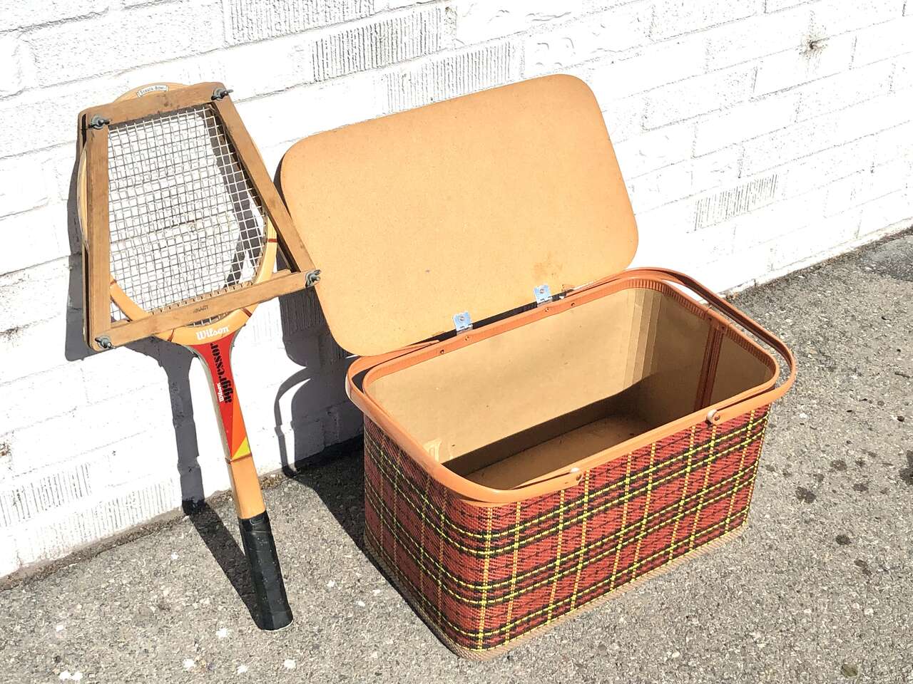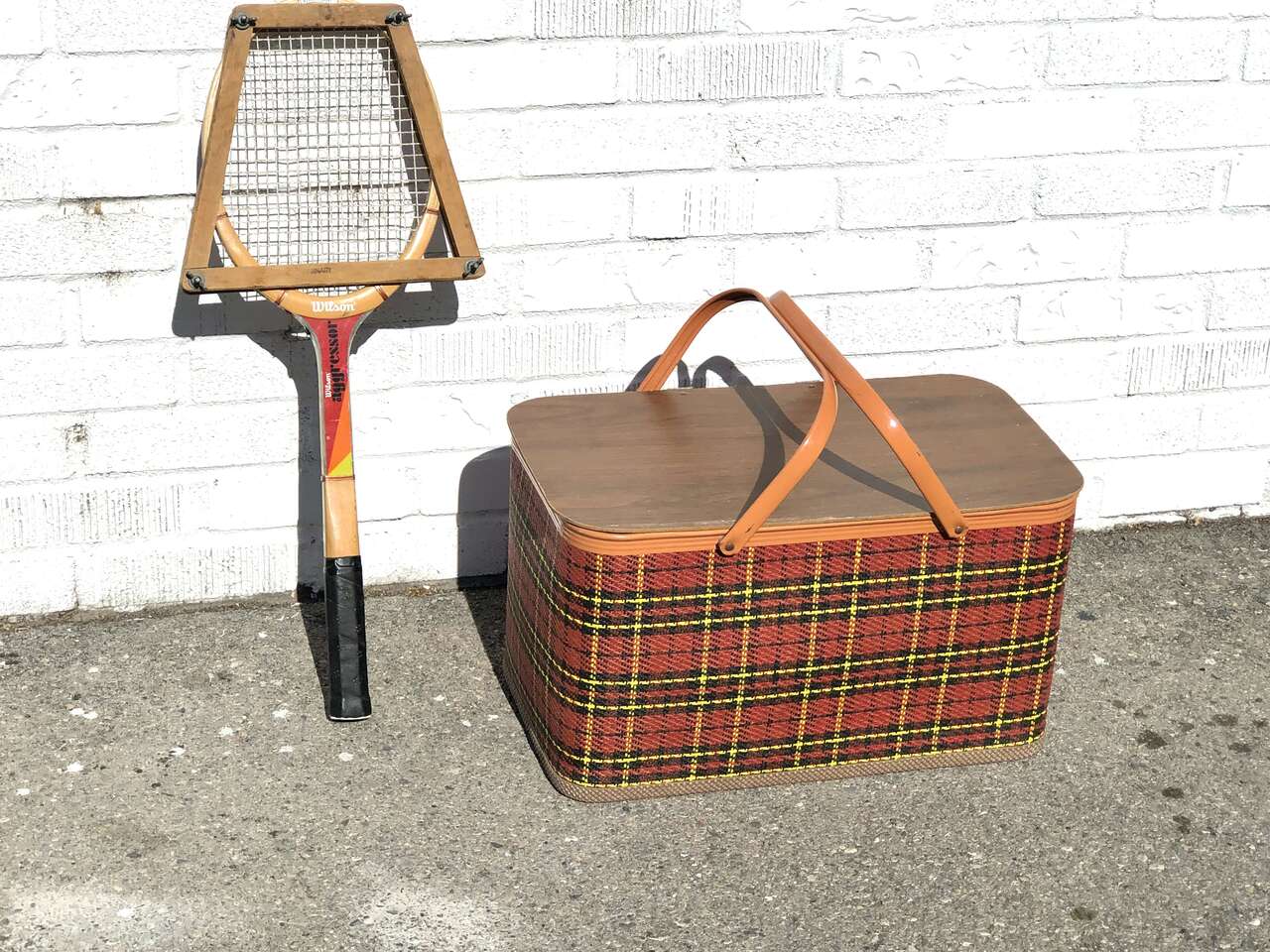 what a great picnic basket does your next concert, party, or whatever! it's in great condition and the colors are fantastic! Ithe vintage tennis racket is for sale as well (I have a few more awesome rackets with the wooden protective feames on them