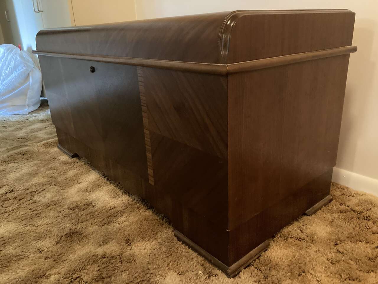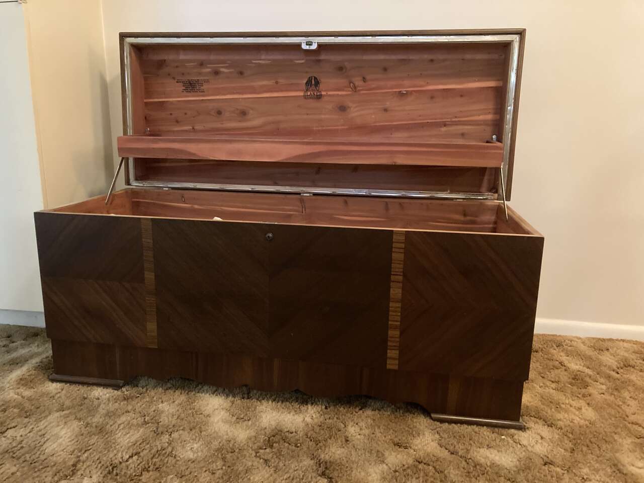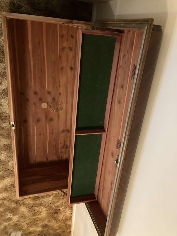 VenmoCedar lined chest, Walnut on the exterior with inlayes, lid has a felt lined shelf built into it.