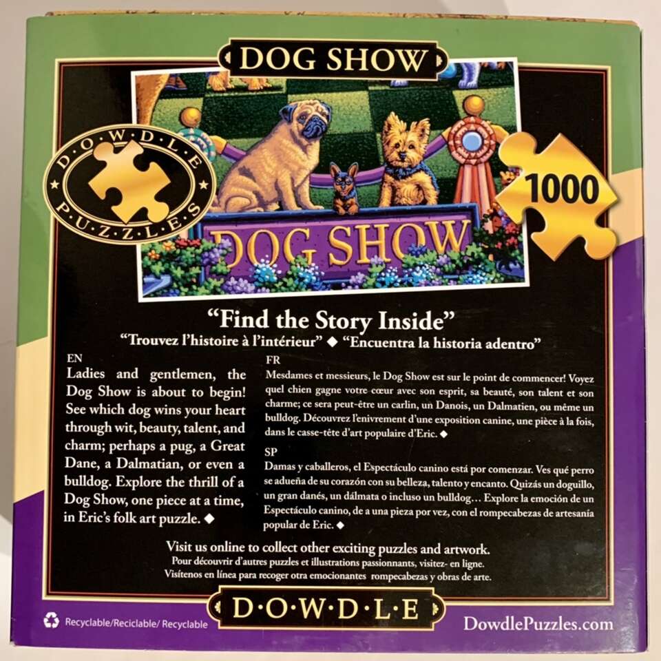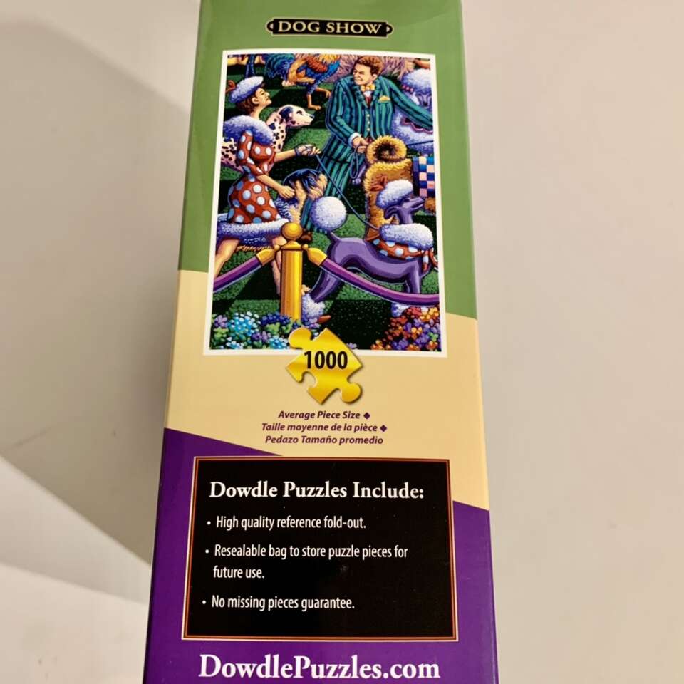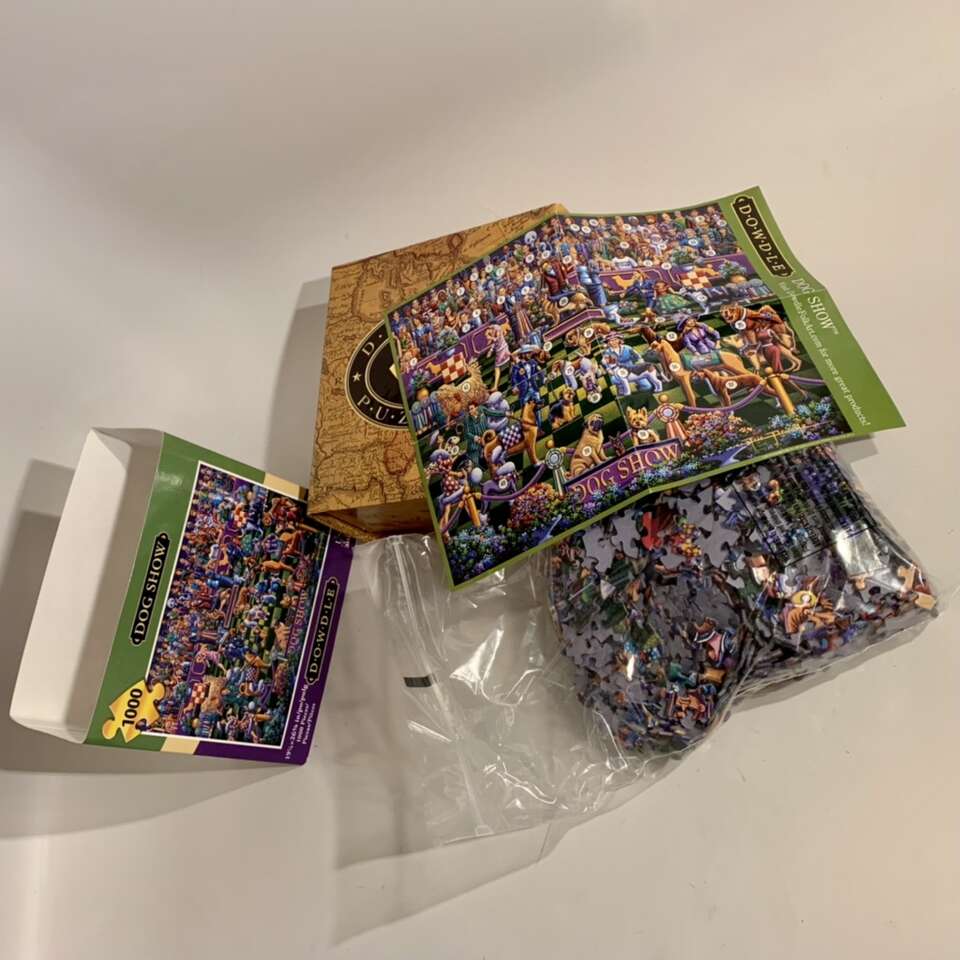 Dog Show 1000 Piece New condition Eric Dowdle Puzzle with slipcase, velcro box, zippered bag and mini numbered poster. Message me if you’re interested in purchasing.
