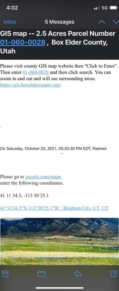 Selling my 2.5 acres of land in Box Elder Utah for $2,500 Land has not yet been surveyed, so you will have to look it up threw the GPS coordinates which are 41 11 34.5 N 113 50 25.1 W Brigham City UT. Selling because I’m a land investor so I buy and sale across the U.S. my names Mike contact information is 38FIVE-338-7480 text is best.