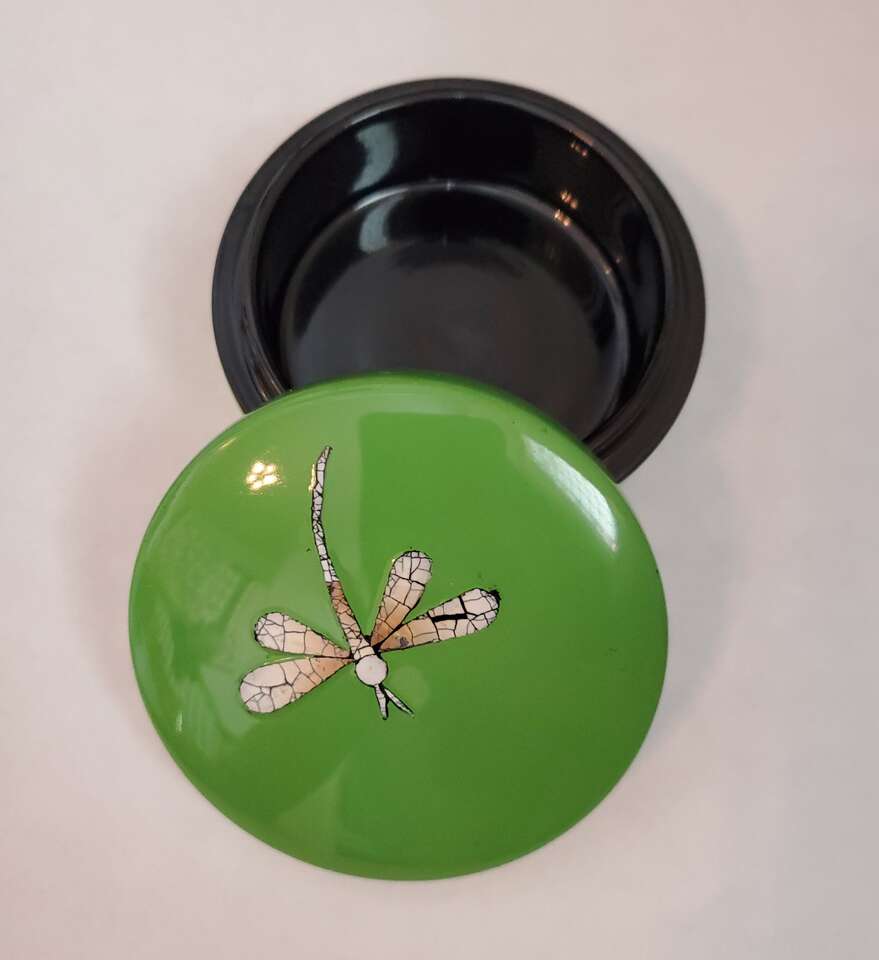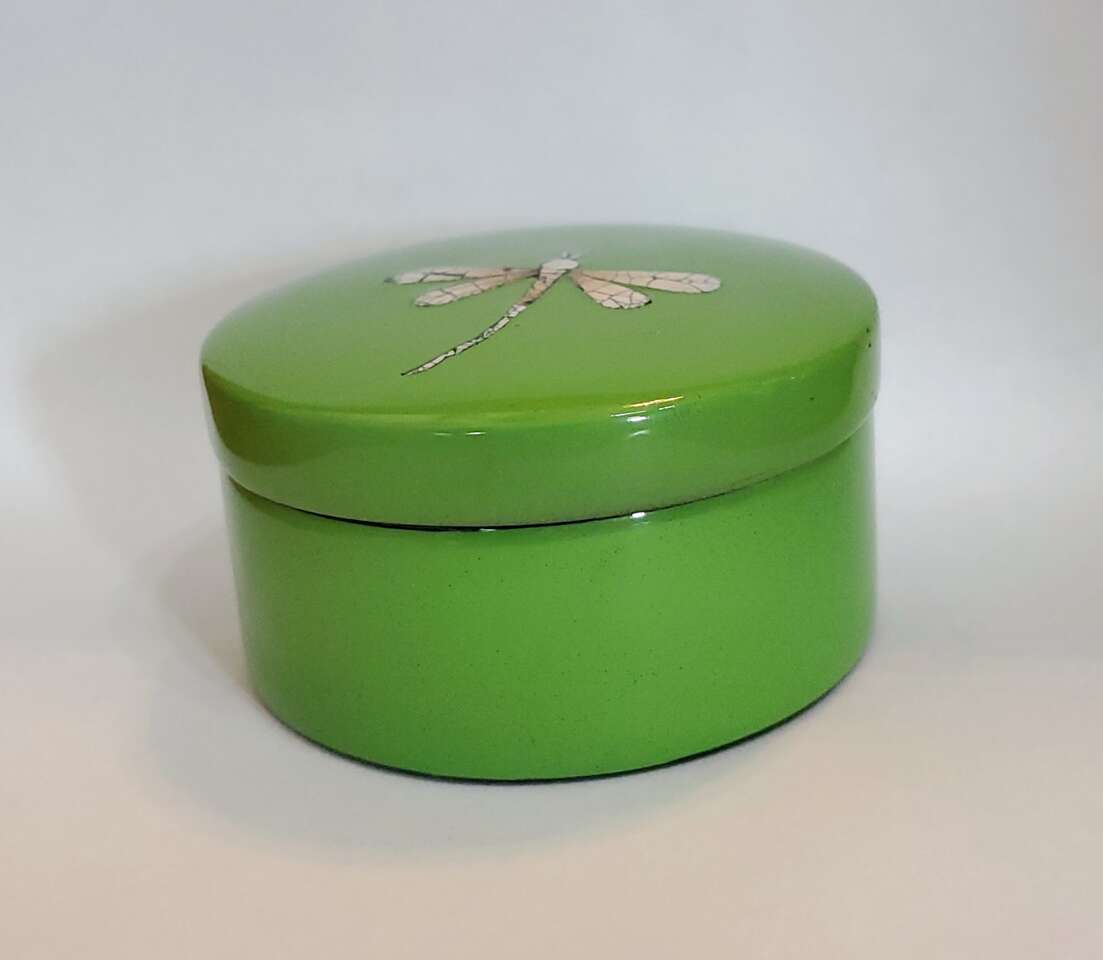Green Lacquer Dragonfy Jewelry Box With Eggshell Dragonfly Design.