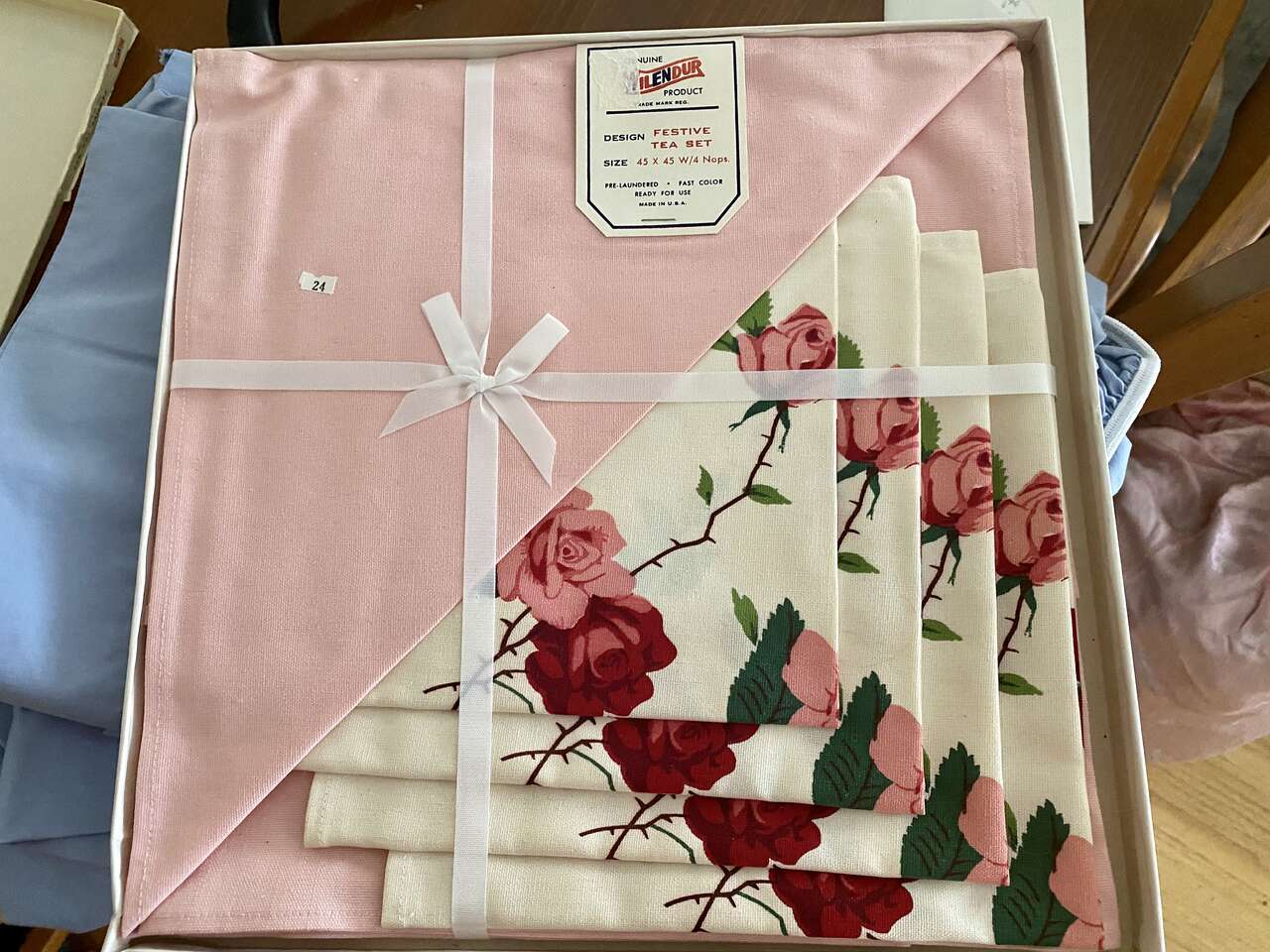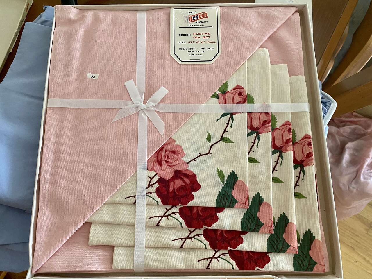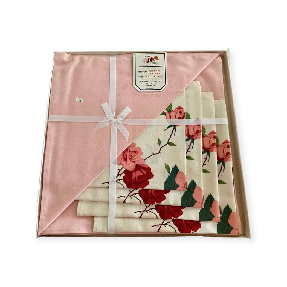 NEW - Vintage 1950s Wilendur Pink Rose Tablecloth 45x45 &4 Napkin Set - In SEALED BOX - C PICS. COMPARE AT $170 with Shipping. Such an amazing find! Perfect for a summer luncheon in the garden.