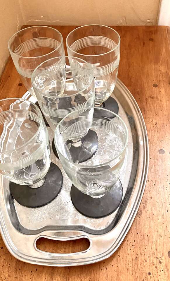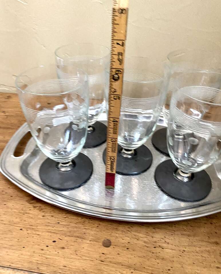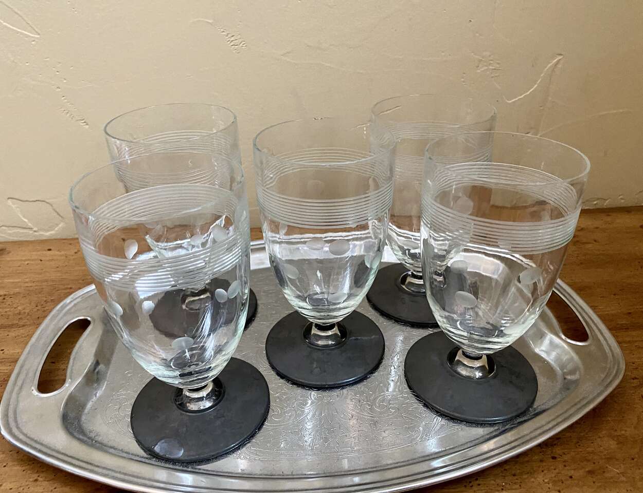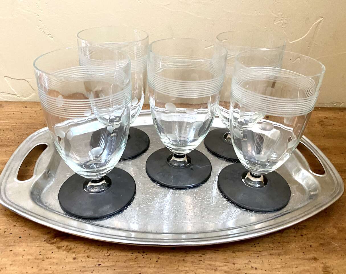 SET OF 5 - 1950s Stunning Vintage CRYSTAL GLASSES- Unique Dots & Stripes - MATT BLACK Footed Bottom- Many Photos. I believe these glasses are from the 50s. They are super Unique in their detailing. No chips, cracks, or breaks.