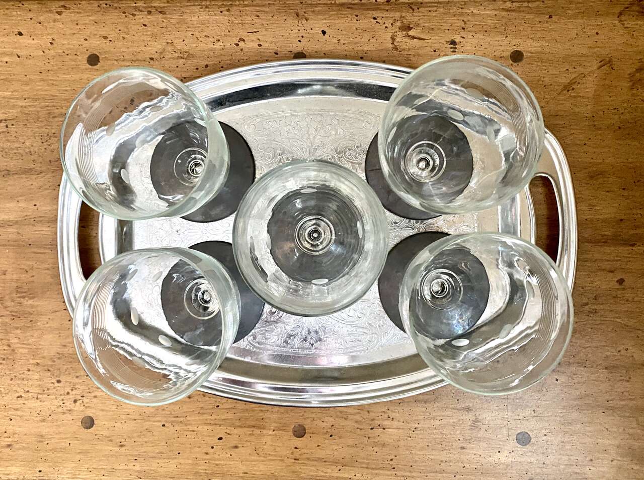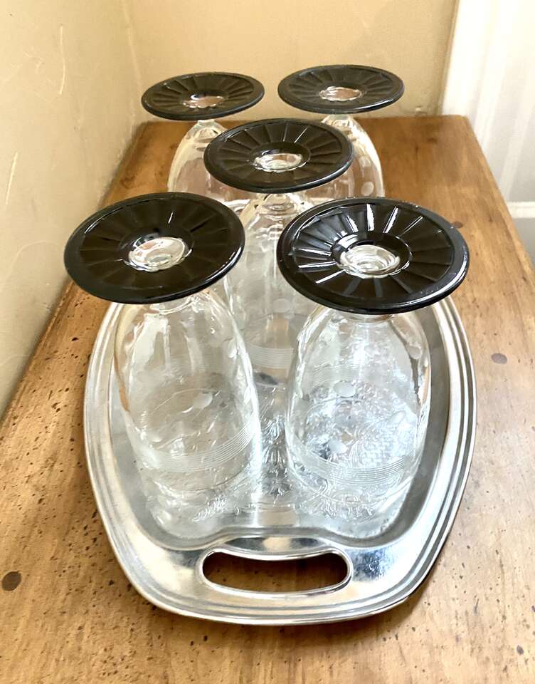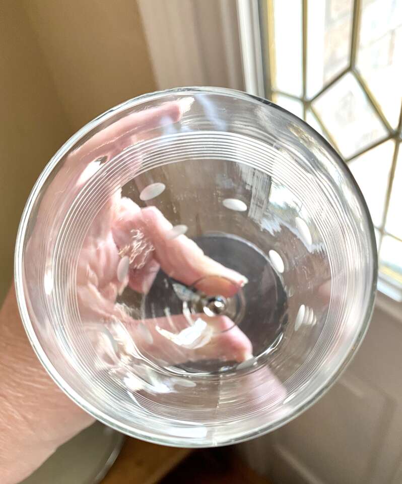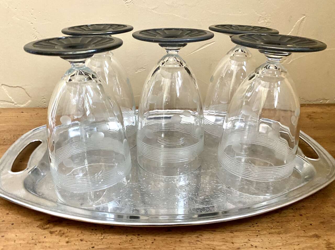 SET OF 5 - 1950s Stunning Vintage CRYSTAL GLASSES- Unique Dots & Stripes - MATT BLACK Footed Bottom- Many Photos. I believe these glasses are from the 50s. They are super Unique in their detailing. No chips, cracks, or breaks.