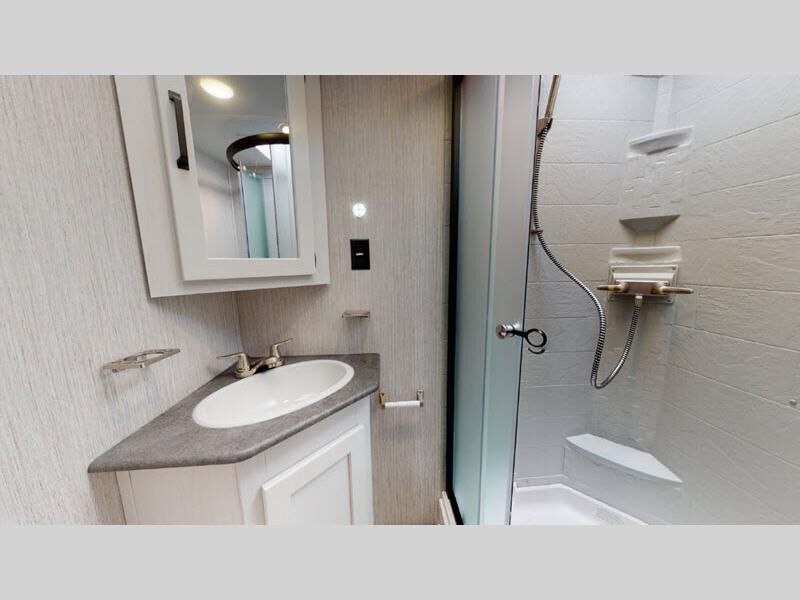 The chef will love cooking in this fifth wheel with the rear kitchen! You can even add an optional exterior micro kitchen with a griddle to breathe in some fresh air while you cook. The booth dinette slide is not only great for enjoying meals and playing card games, but also for transforming into an extra sleeping space if needed. Draw the privacy curtain to create a front private bedroom with a queen bed that has shirt closets on either side. There is plenty of storage throughout the inside between the pantry, the closet, the linen closet, the wardrobe, and even the entertainment center has overhead cabinets for your movies!