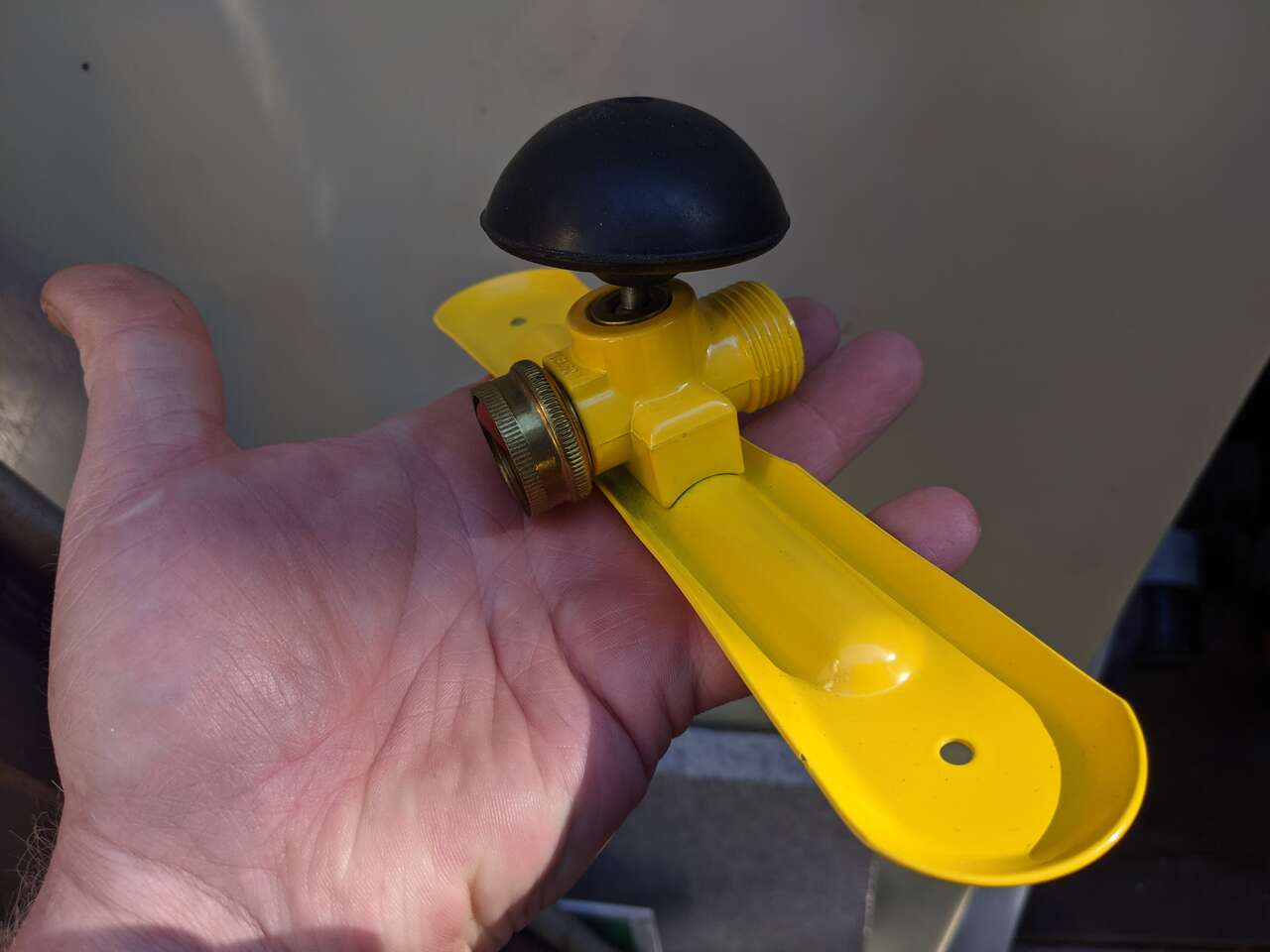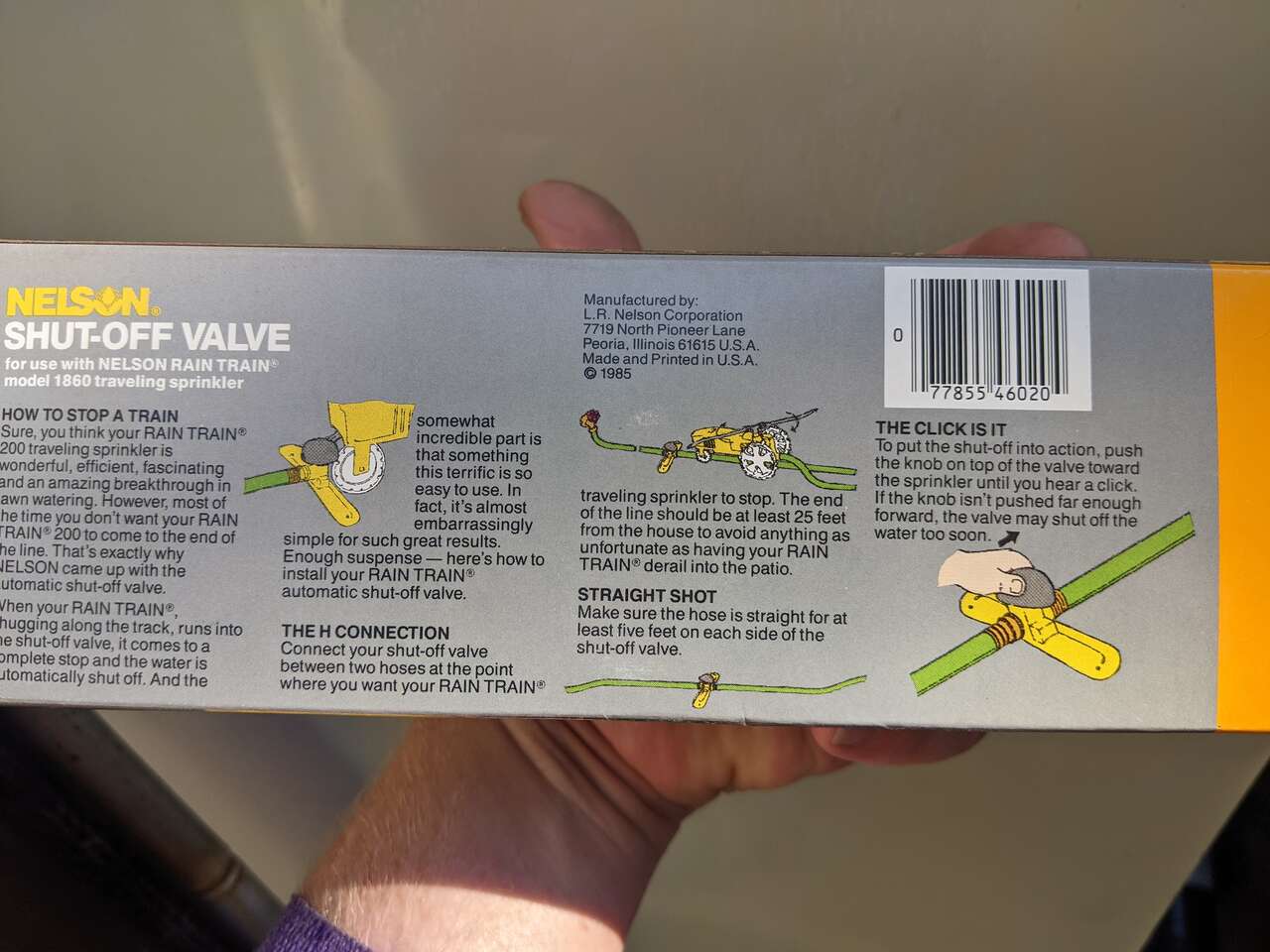 This is hard to find traveling lawn sprinkler water shut off. Brand new in the box. Works with any brand and shuts off the water once the sprinkler gets to the end of the hose.