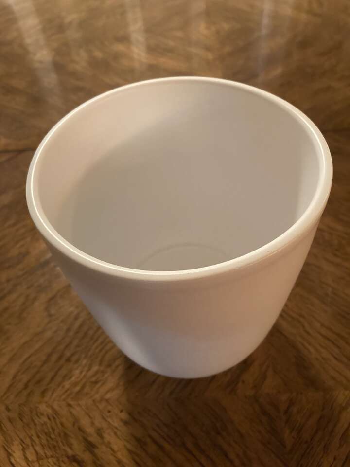 Mate white planter pot. 6" tall 4-1/2 " at the top inside dimentions, and 3" at the bottom.