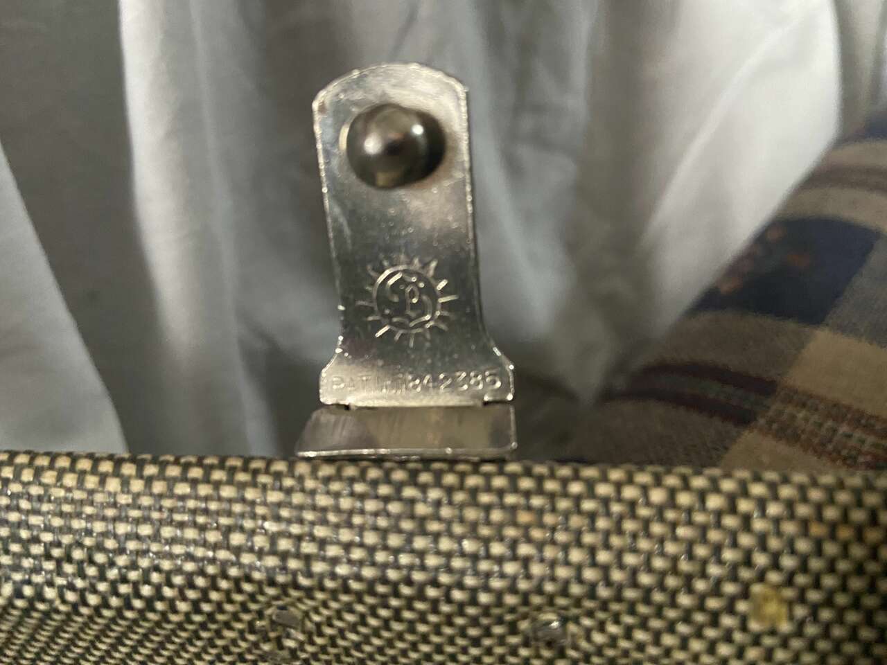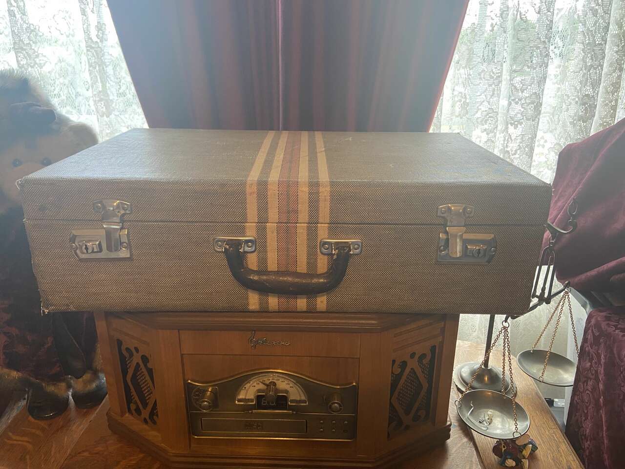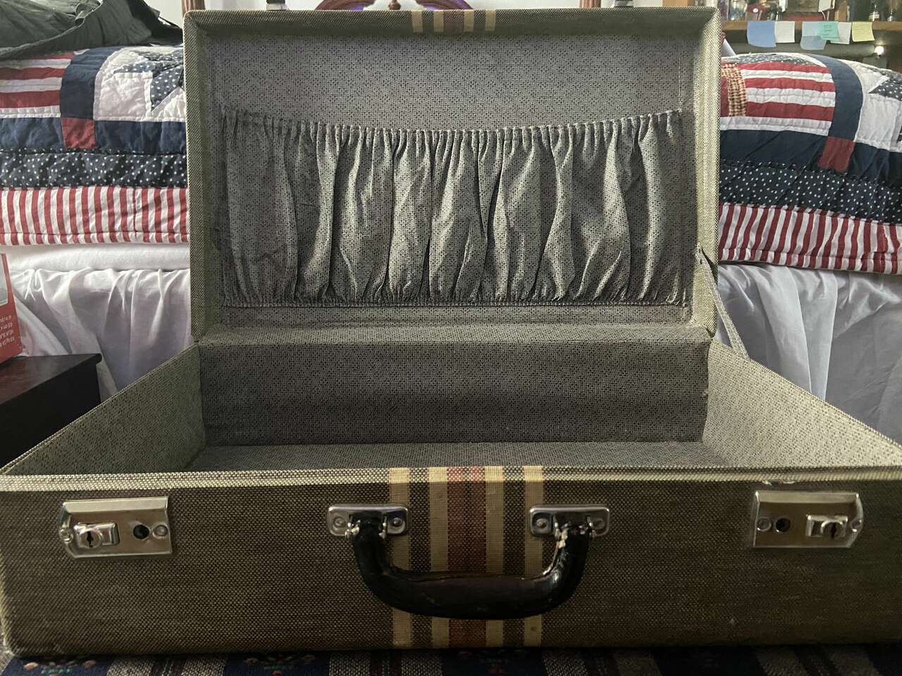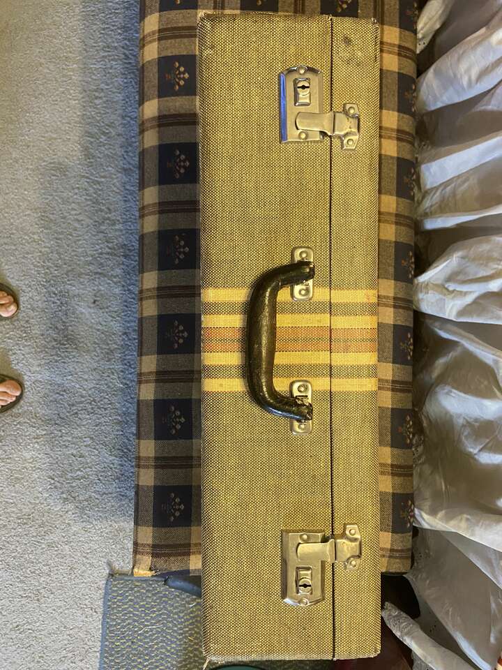 This suitcase has been in storage for 8 decades. Both luggage latches work well but there is no key for the locks. The exterior tweed is in decent vintage condition, with a few marks, but no tears, large stains or indentations. There is some wear adding to the vintage look of the piece. The exterior fabric is a dark gray with complementary cream and faded red stripping. The interior luggage compartments and fabric are in excellent condition and the elastic is still tight and not sagging. I obtained the date for this piece by the patent # (1842385) obtained Jan 28, 1932 by O.A. Boesel. on the latch. see pics for documentation. This piece is an excellent candidate for transformation into a side table with storage.Dimensions: 21 W x 13 T x 6 D This Item is for LOCAL pickup only. Thank you for your interest.