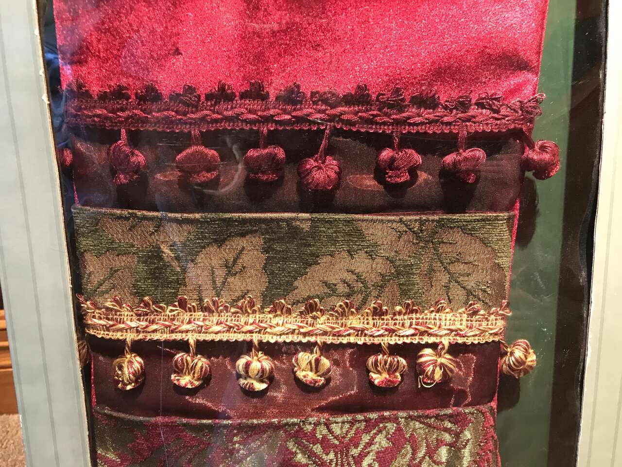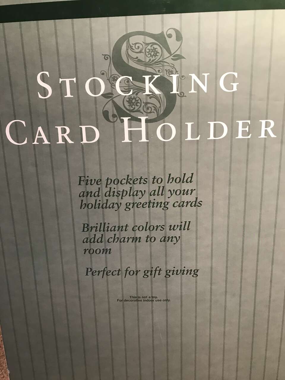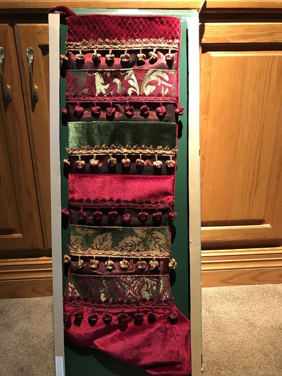 Christmas Stocking Greeting Card Holder 34” long x 14” wide, Burgundy, Embellished, Costco purchase. Has a gold rope attached to top for hanging.