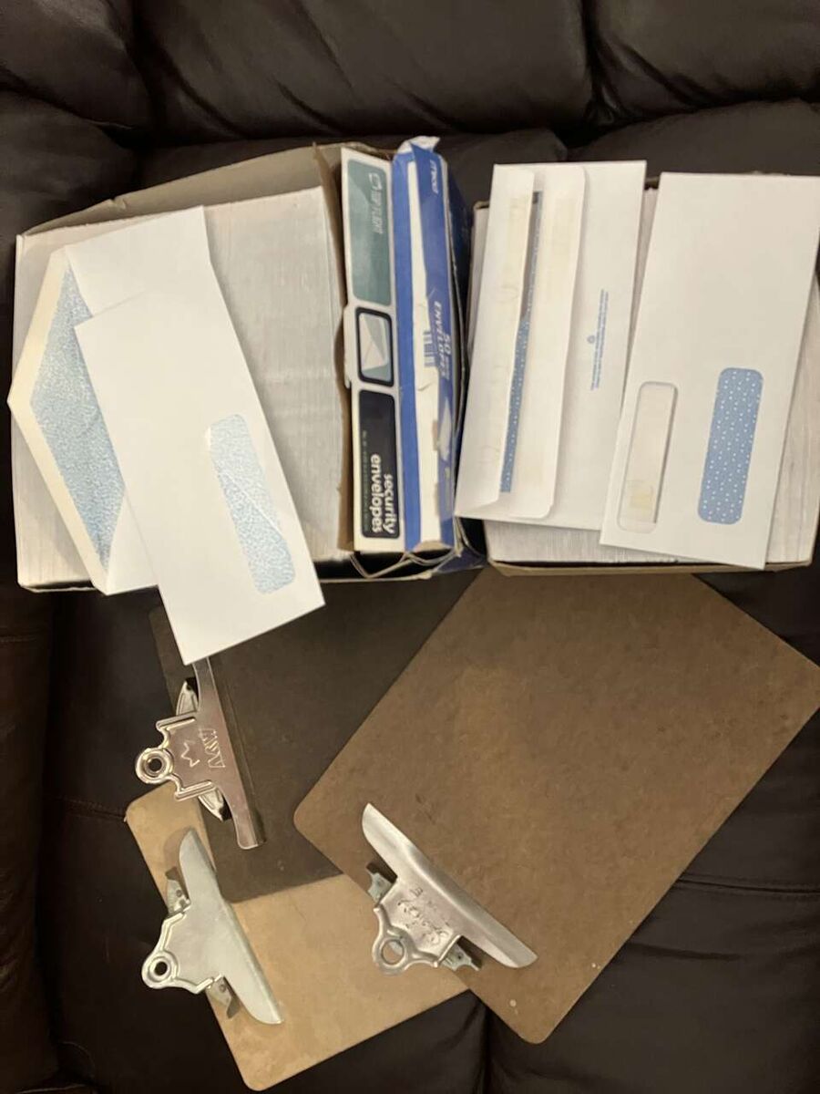 VenmoENVELOPES (SOLD); 3 CLIP BOARDS 9" X 12" with METAL TOP CLIP $3/set. Box of 12 Binder Clips, $1, Hand-held Paper Hole Punch $1; Compass w/lead refills, $2; Box of 100 Thumb Tacks $1; Box of 50 White Tacks $.50; White Labels $.50. Pencil Sharpener $.50. Cash/Venmo. In Sandy. 801-201-5350. See all 3 photos.
