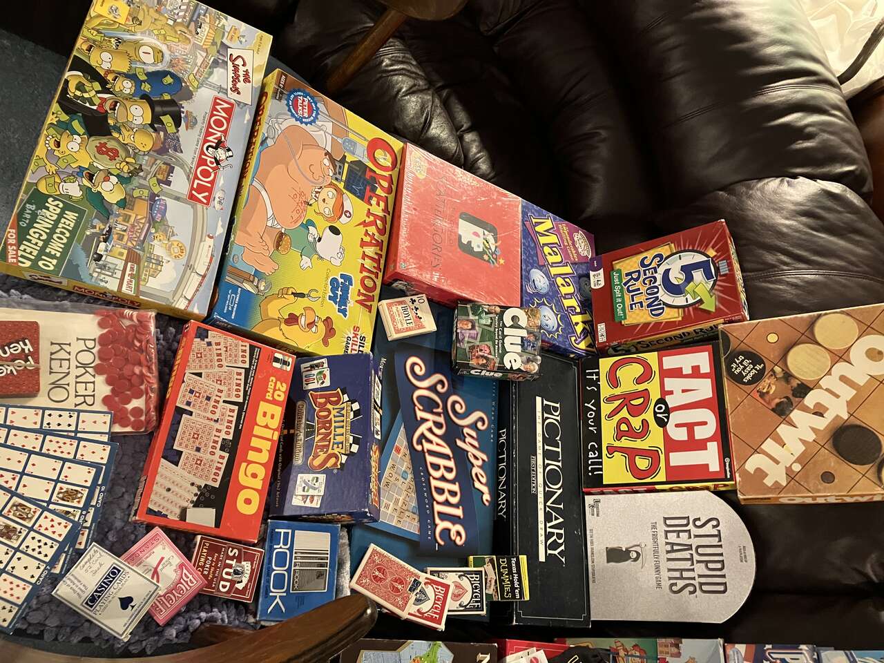 STUPID DEATHS, $14; SUPER SCRABBLE, $14; CLUE The Card Game, $9; PICTIONARY $12; SCATTEGORIES $14(SOLD); FACT or CRAP, $14; SIMPSONS MONOPLY, $14; TEXAS HOLD'EM FOR DUMMIES Card Deck, $3; 5-SECOND RULE, $14; MALARKY, $14; KENO POKER $4; Phase 10 Deluxe Card Game, $9.