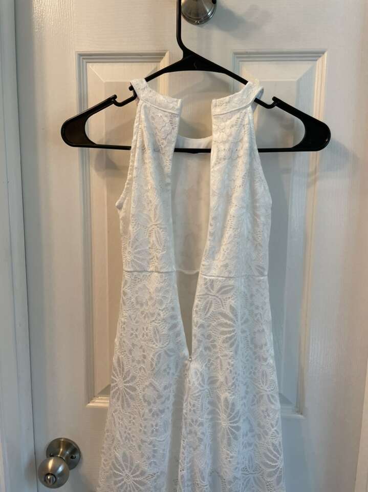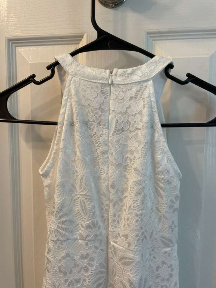 Girls’ Elegant hi-lo dress with a halter neck and floral lace. It can be used for so many different occasions. My daughter wore it to my beach elopement and it was perfect!