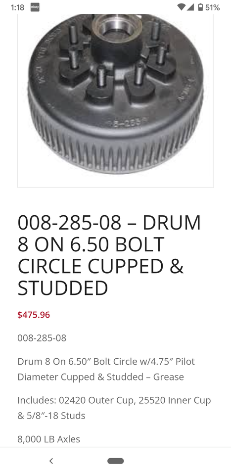 Drum 8 On 6.50″ Bolt Circle w/4.75″ Pilot Diameter 8,000 LB Axles