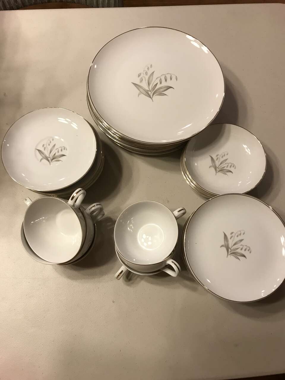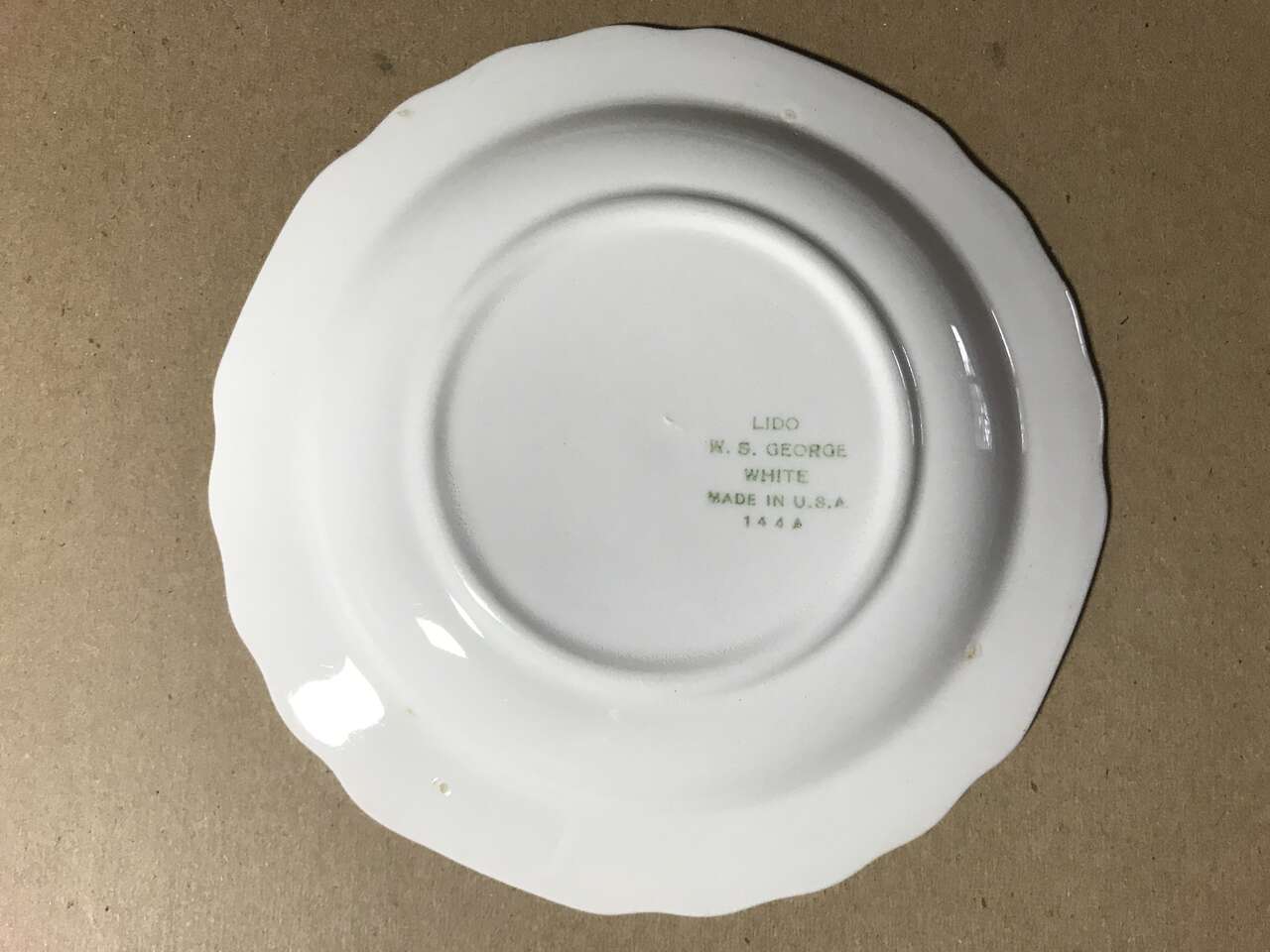 Lido W. S. George White Flower and Gold Rim pattern, made in USA antique dishes, 43 pieces which includes 8 Dinner Plates, 7 Bread Plates, 8 Dessert Bowls, 6 Cereal Bowls, 5 Cups, 6 Saucer Plates 1 Sugar Bowl and Lid, 1 Serving Platter, 1 Serving Bowl. some have chips but all is still very useful. If you are interested in more pictures. Please let me know.