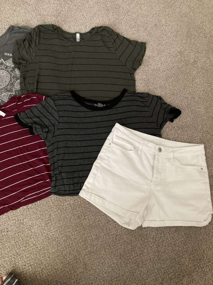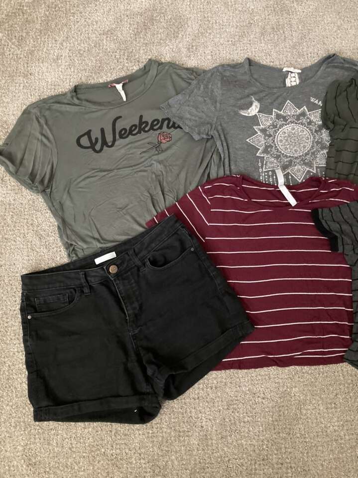Clothing lot for sale, 5 shirts and 2 pairs of shorts, all in good condition. The shorts are size 7/8 and the shirts are all size M/L. Smoke free home. Text preferred.
