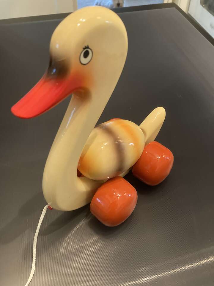 Vintage kouvalias wood pull toy 8 1/4" tall, egg spins end for end when you pull it.