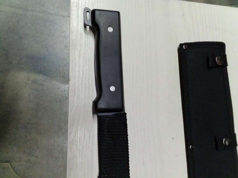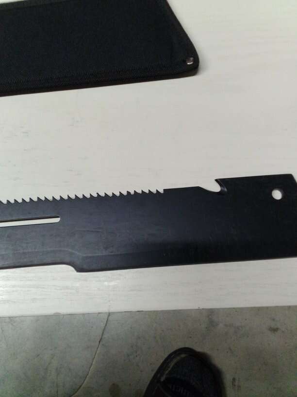 23 inch overall length two and a quarter inch wide blade bone saw gutter or paracord cutter slot for bending double edge with sheath