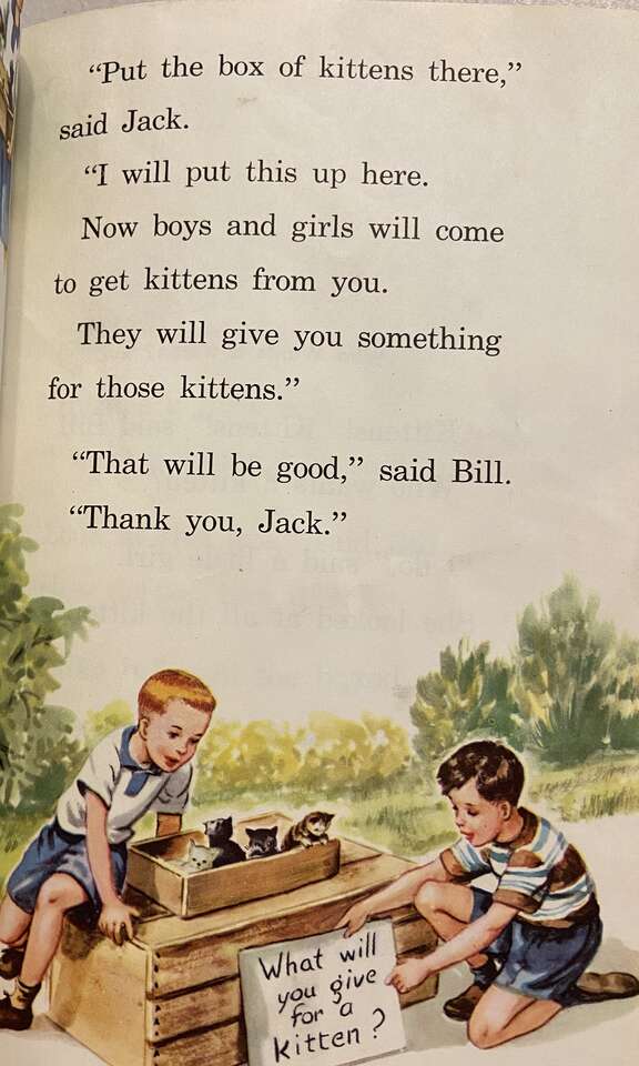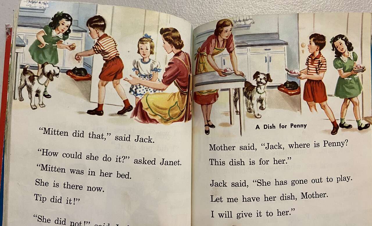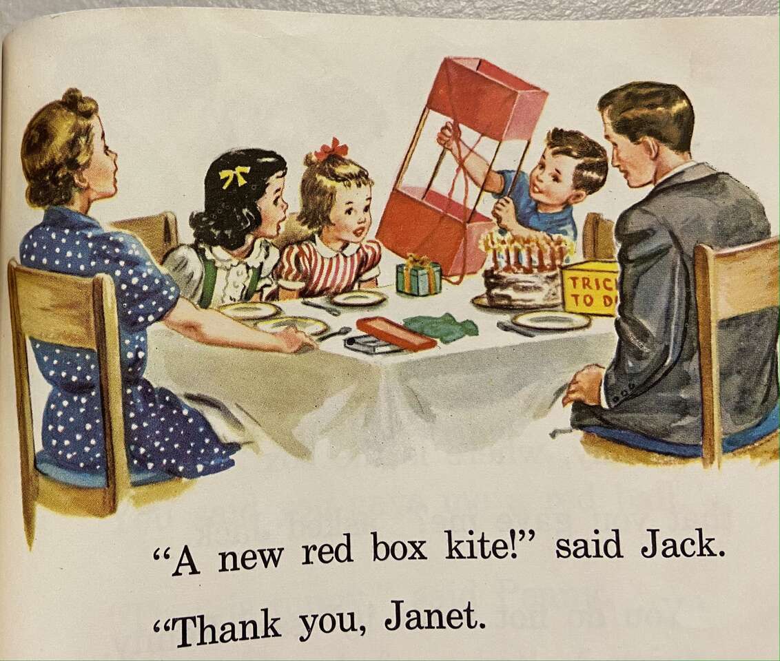 VenmoJack and Janet Reading for Meaning; Houghton Mifflin, Riverside Press, Boston. 1949/57. Revised Edition. This First Grade reader was the standard in US Elementary Schools for 20 years. The stories are simple and idealic. Parents are present and the nuclear family is the norm. The children in the stories use their immagination in play. Condition: Good, meaning the cover is worn, but the binding is tight, the pages crisp and the colors bright.