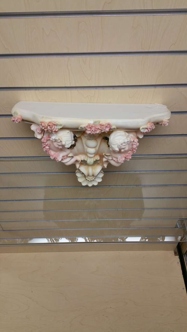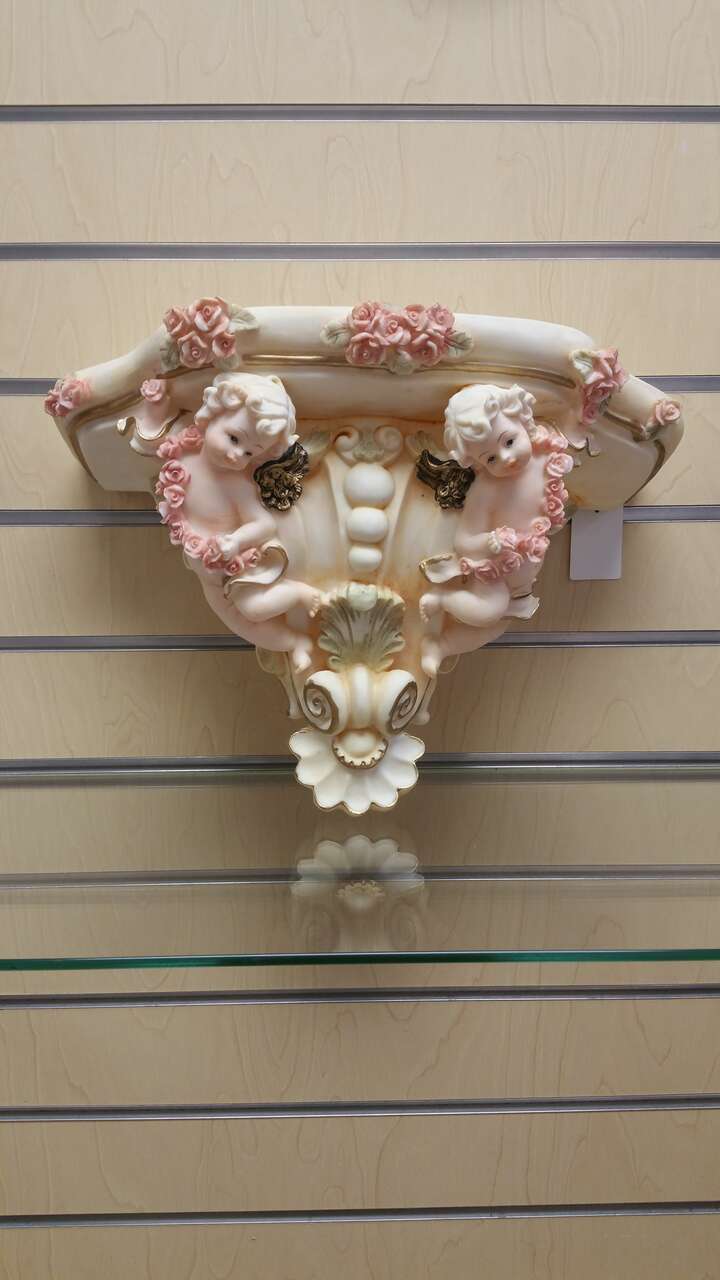 VenmoDecorative floating wall shelf / mantel with angels 5+ available Dimensions Height - 8.5 inches Length - 13.5 inches Width of the top 6 inches Color - off white, pink , multicolor Material - poly resin Condition - new in a box