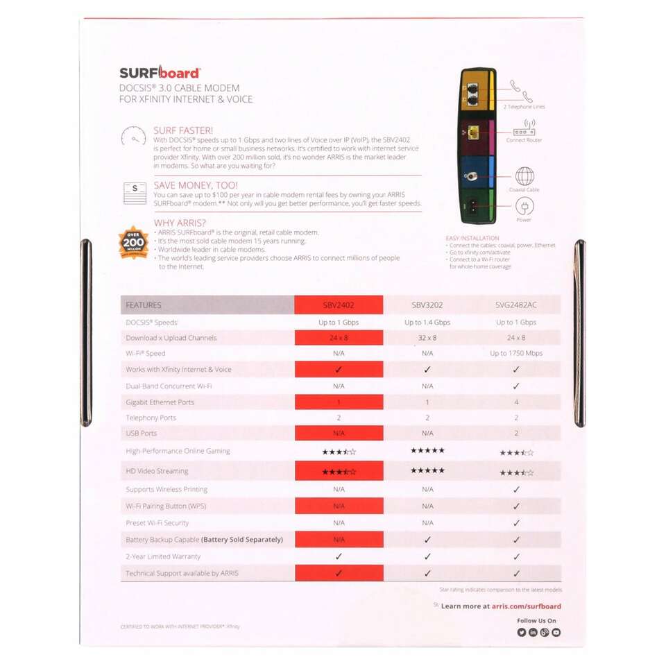 NEW. Sealed box The ARRIS Surfboard SBV2402 is a DOCSIS 3.0 Cable Modem Certified for Xfinity Internet & Voice Service. The SBV2402 has 24 downstream and 8 upstream channels and is best for cable internet speed plans up to 600 Mbps (always check with your cable internet provider to confirm compatibility with your service plan). It is equipped with a 1 Gigabit Ethernet port which can be used to connect to a Wi-Fi router, plus 2 Telephony Ports for digital voice service. Setup is simple with just a few steps and a visit to the Xfinity online self-activation portal; you will have your network up and running in no time. It is compatible with any Wi-Fi router and will only work with Xfinity Digital Voice Service. Power the 3.0 Cable Modem with 24 downstream and 8 upstream channels Two telephone ports to take full advantage of Xfinity voice services One Gigabit Ethernet port connects to your existing Wi-Fi router for whole-home networking Certified and optimized for use with Xfinity internet & voice service Best for cable internet speed plans up to 600 Mbps Does not include Wi-Fi. Compatible with any existing Wi-Fi router.