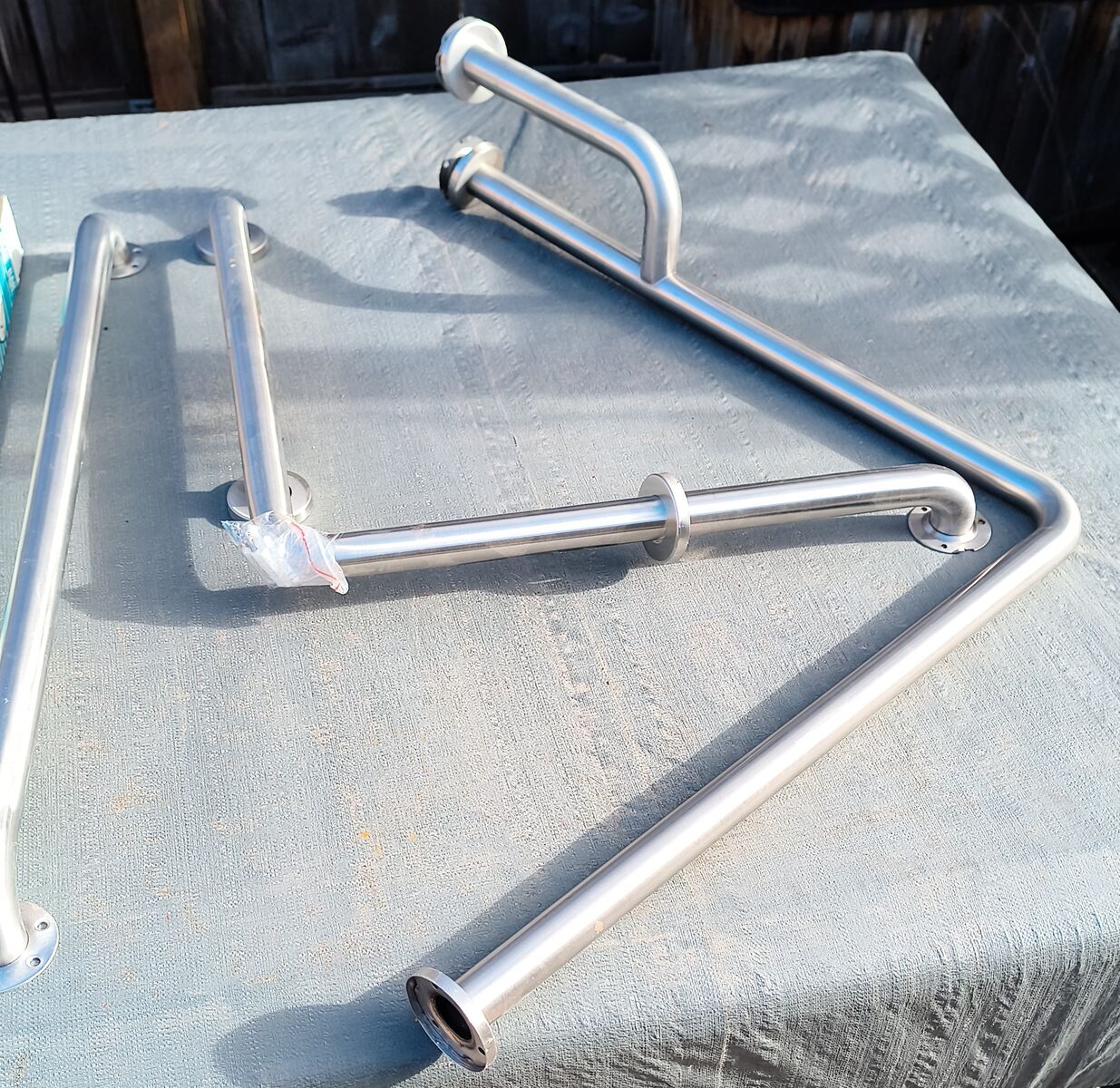 I have several Safety Grab Bars, both single hand and extended length, that are in new condition and are very heavy duty construction. These are the safety bars required in all bathrooms now-a-days and I have used them many other places to help in safely navigating the property. They are handy on corners or step-up situations especially if the area is prone to water and ice. Make really great dog tie-out connections so the dog has a little more movement area. If you think for a few minutes you can come up with a lot of very useful ideas for these. Selling for various prices based on the size, if you need just one or two they are $25 for the long ones (42 or 36) and $15 for the short ones (24). I also have some hand sized and a couple that was apparently custom made so you would need measurements (see separate ad). Shipping would be expensive and difficult due to the unusual shapes but would be possible, call and we can discuss. Available list is subject to prior sale and will change on a daily basis.