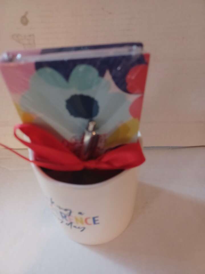 OVERSIZED CERAMIC CUP WITH RIPPLED RIM AND CAPTION THAT READS, "MAKING A DIFFERENCE EVERY DAY." THIS CUP ALSO INCLUDES A WRITING PEN AND A SMALL DAYTIMER/ NOTE BOOK. JUST $7