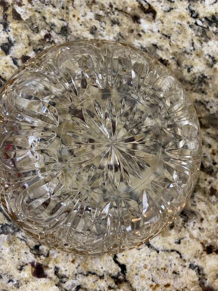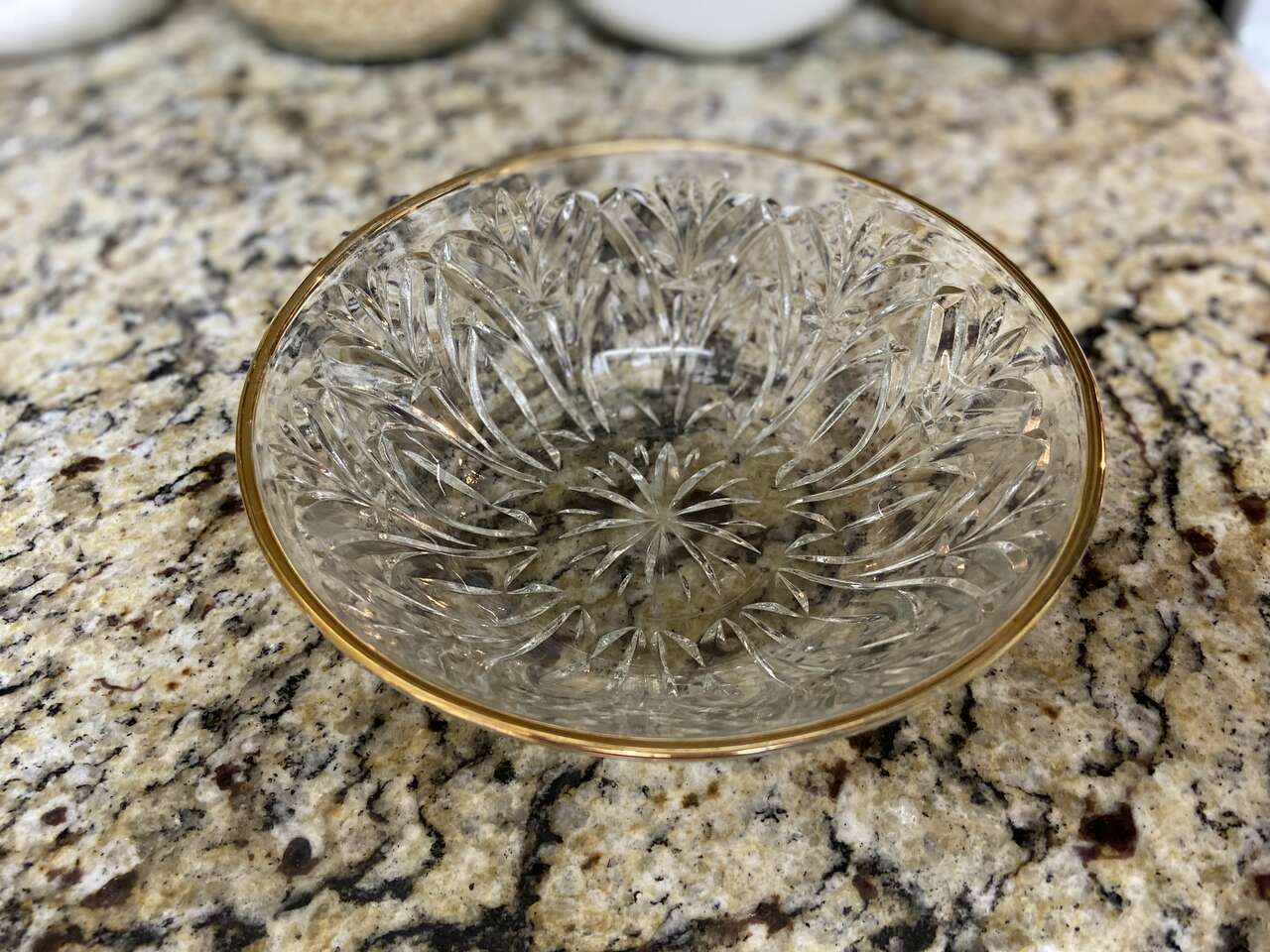 VenmoVintage 1960's Pressed Glass Serving Bowl w/ gold trim. 8" Diameter , 3" Base, 2.75" Deep.