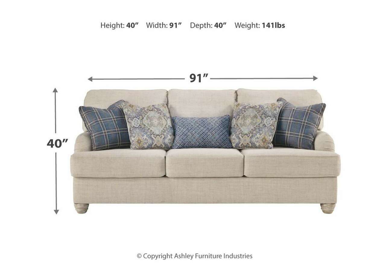 Don't be shy take a seat on this farmhouse-style sofa. Dressed in a modern and relaxed linen-weave upholstery, it's a luxurious complement to rustic accents with its light and airy palette and elegantly turned feet. What a picture-perfect finish to any shabby chic or countryside living room. Corner-blocked frame Attached back and reversible seat cushions High-resiliency foam cushions wrapped in thick poly fiber 5 toss pillows included Polyester upholstery; polyester pillows Exposed turned feet with faux wood finish Platform foundation system resists sagging 3x better than spring system after 20,000 testing cycles by providing more even support Smooth platform foundation maintains tight, wrinkle-free look without dips or sags that can occur over time with sinuous spring foundations