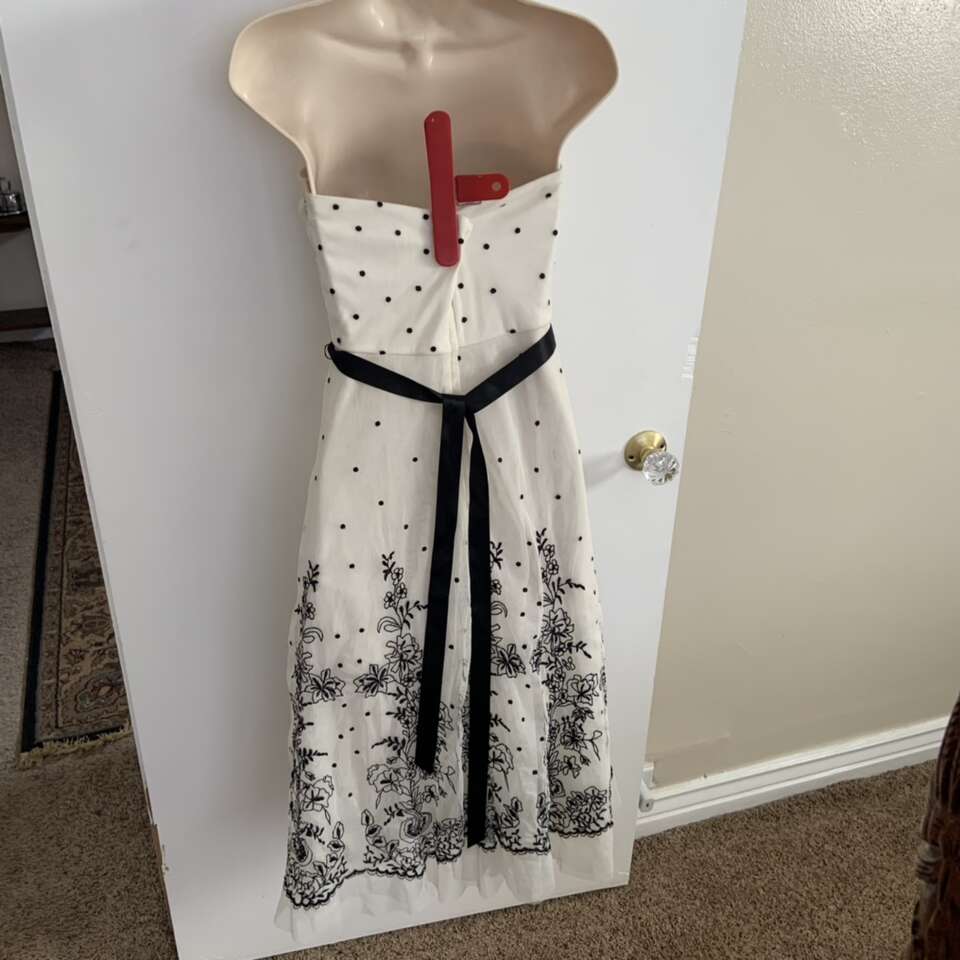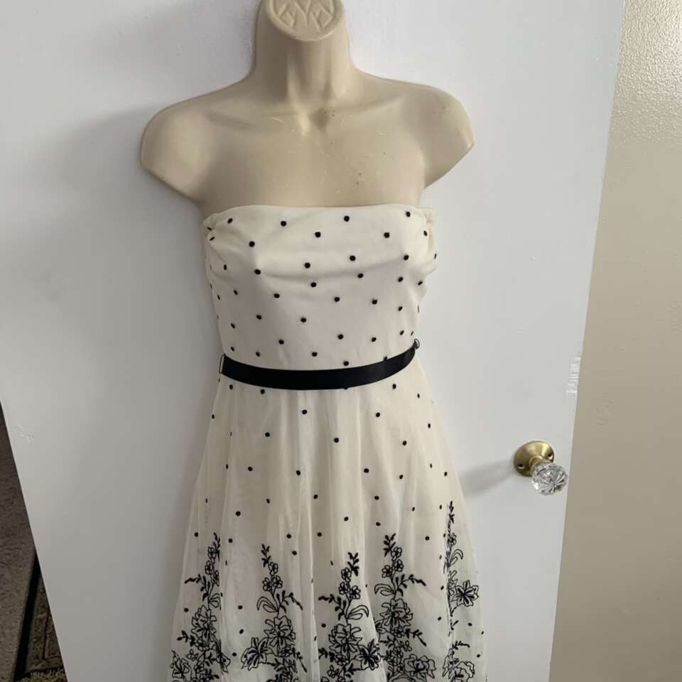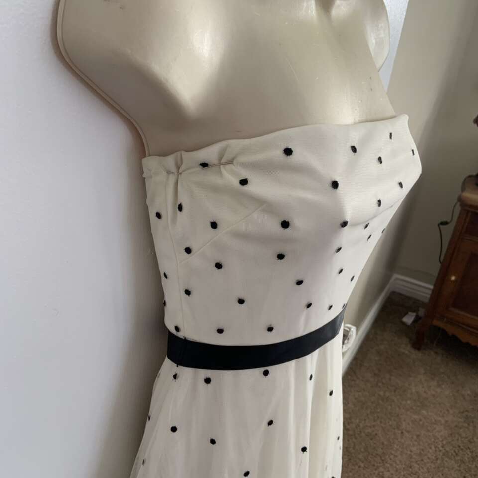 BCBG Maxazria Black and White Polka Dot Floral Tea Length Dress Size 4 Good condition it does have some small holes from where safety pins were placed
