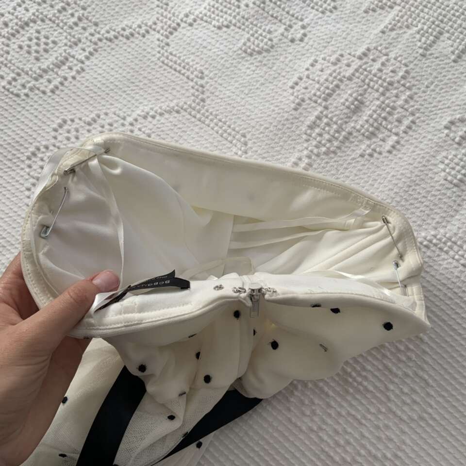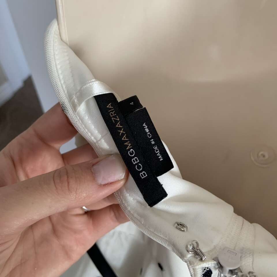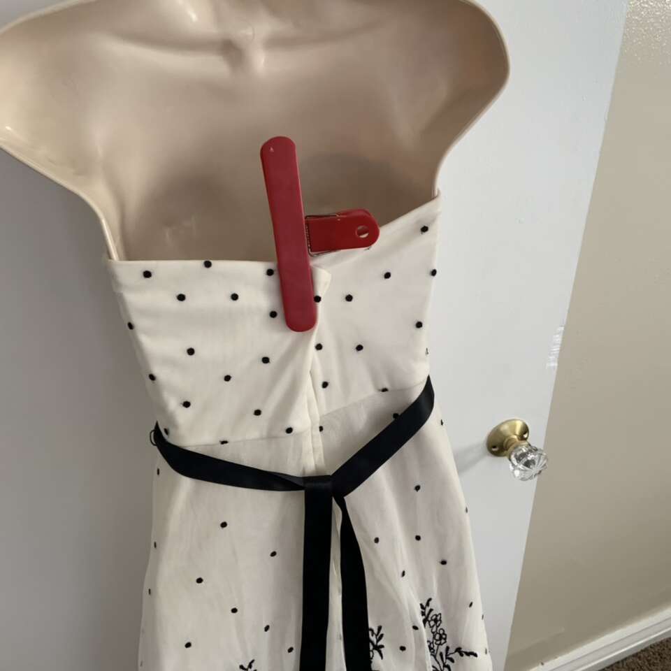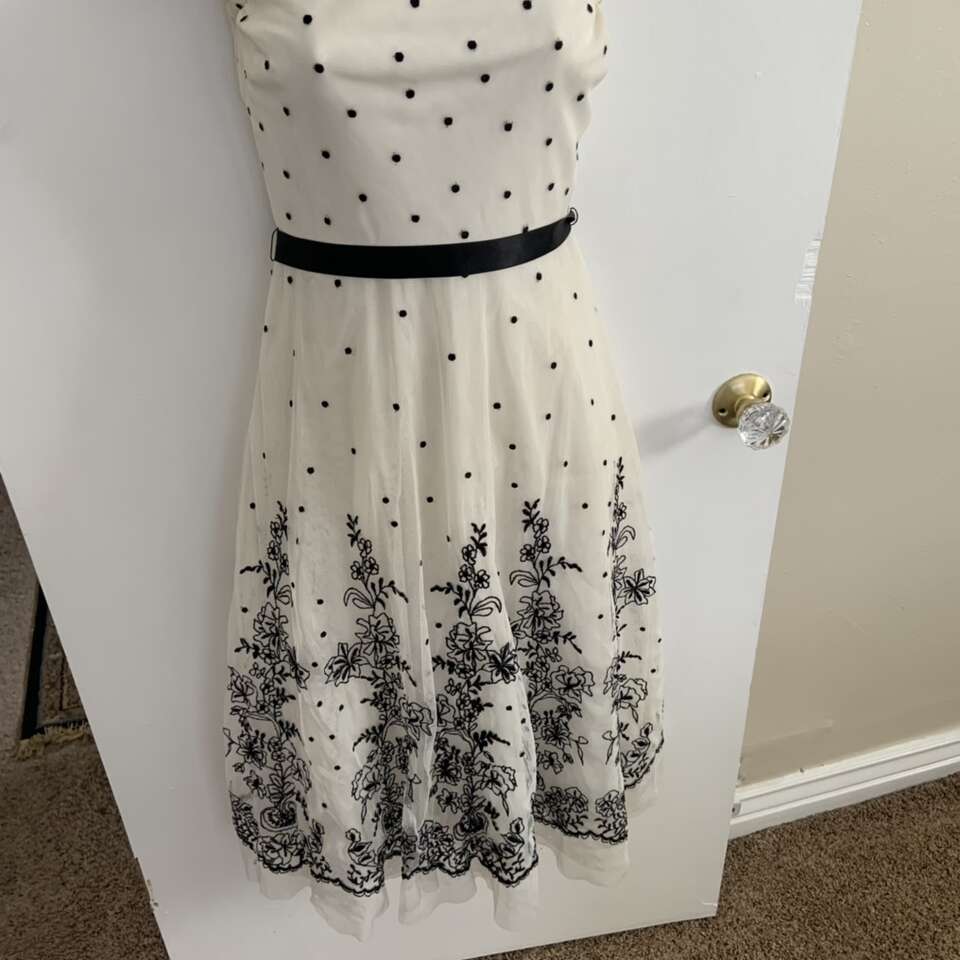 BCBG Maxazria Black and White Polka Dot Floral Tea Length Dress Size 4 Good condition it does have some small holes from where safety pins were placed