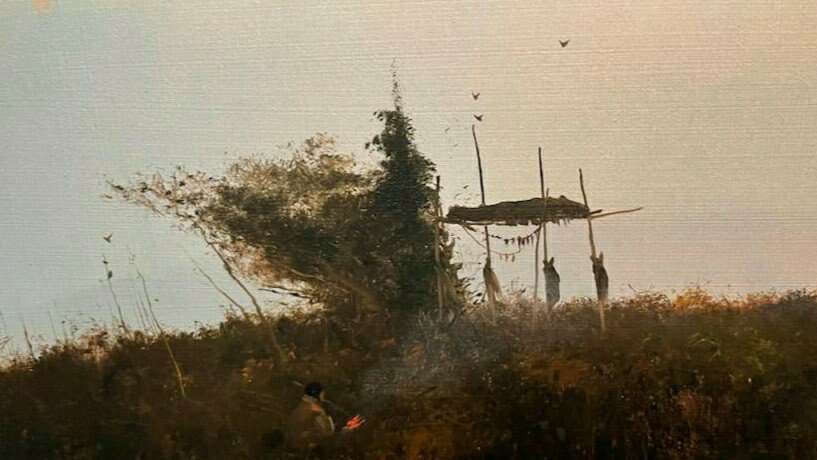 Beautiful original oil painting by Michael Colman. Indian Burial. Original frame. 13 inches by 9.5 inches. Painted in the 90s. Letter of Authenticity from Michael.
