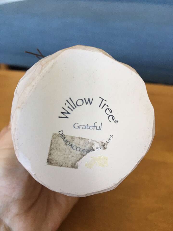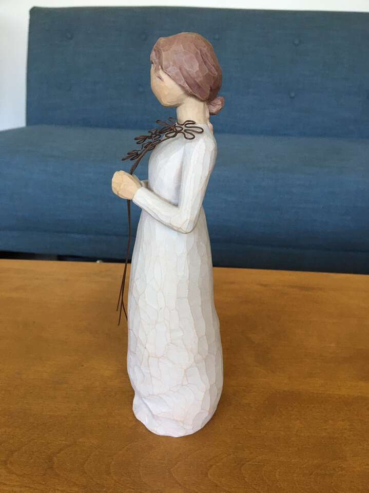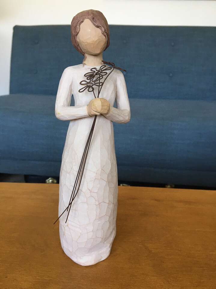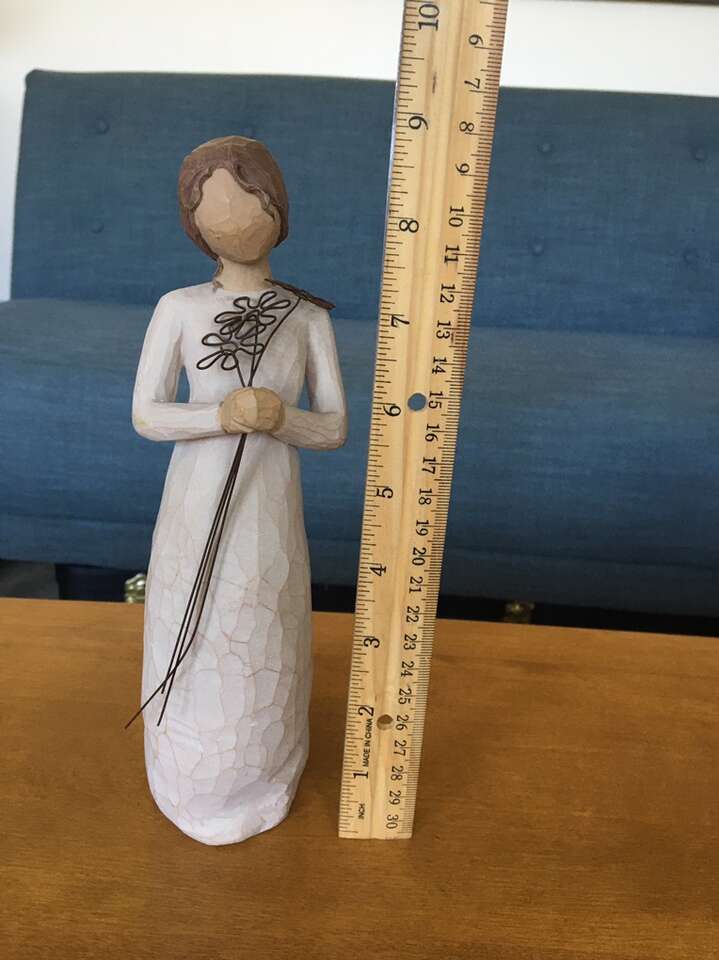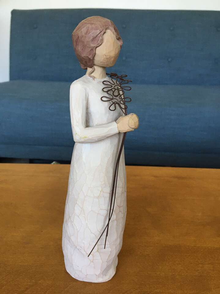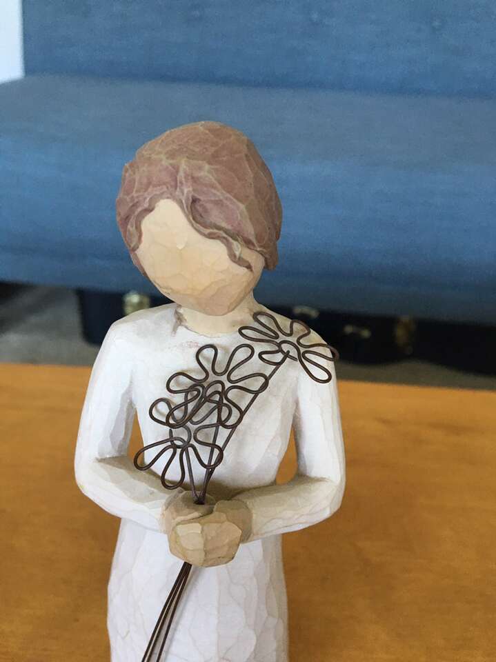 Willow Tree “Grateful” DEMDACO collectible figure, by Susan Lordi, 2004. Standing woman holding 3 wire flowers, brown hair. Hand-painted resin. 9” tall. Excellent condition. Text only. Cash or Venmo.