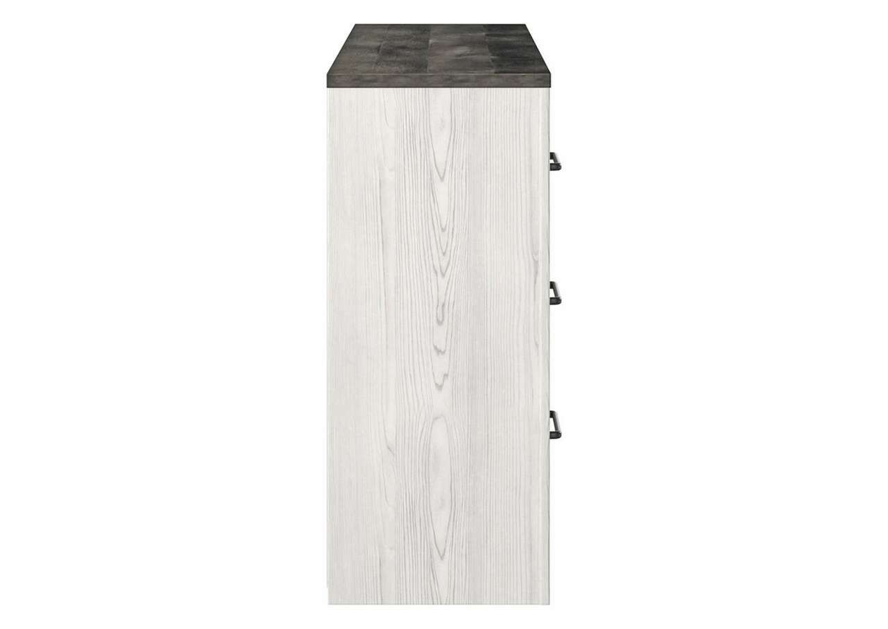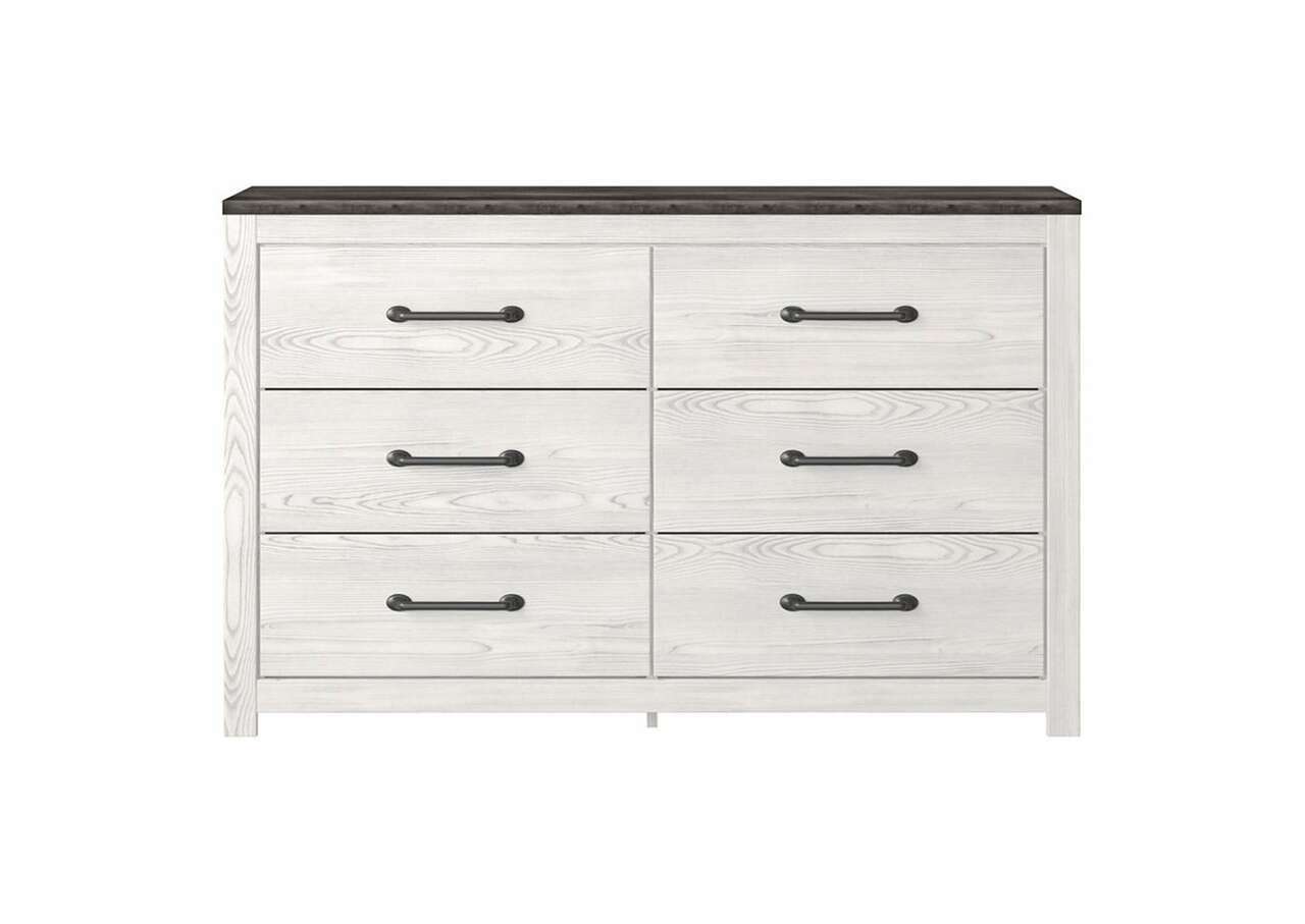 Cool, clean and casually modern. The Gerridan dresser’s wispy whitewash and gray finish sets the tone for your calming sanctuary. Large linear pulls add dimension and authenticity. Six smooth-gliding drawers neatly accommodate your wardrobe needs.Dresser only