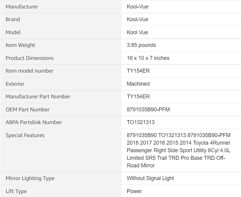 ApplePayNEW KOOL-VUE RH TOYOTA 4-RUNNER POWER MIRROR – TY154ER MANUFACTURE PART NUNBER: TY154ER ITEM NUMBER: T01321313 DIMENSIONS: 16” X 10” X 7” SURFACE FINISH: PAINTABLE