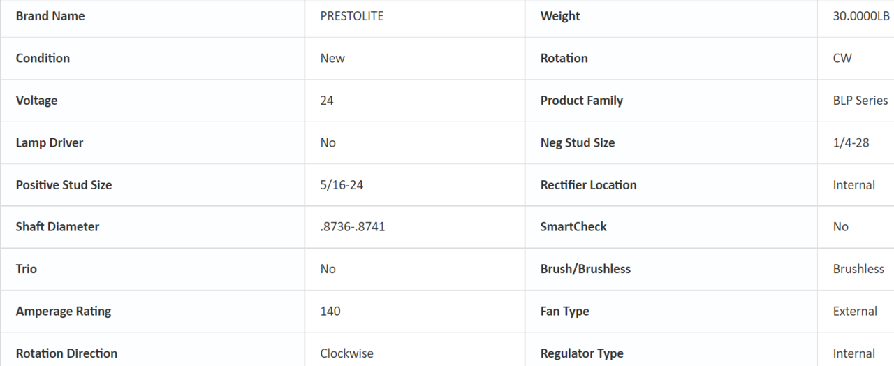NEW ALTERNATOR BLP SERIES BRUSHLESS PAD MOUNT TYPE 24V 140A - BLP3322 PRESTOLITE LEECE NEVILLE ALTERNATOR BLP SERIES MANUFACTURER PART NUMBER: BLP3322 PAD MOUNT PRICE: Only $160 *I ACCEPT CASH, VENMO AND PAYPAL ONLY. **DELIVERY IS AVAILABLE FOR AN ADDITIONAL FEE. ***PLEASE DMS / TEXTS ONLY, I DO NOT RESPOND TO CODED MESSAGES.