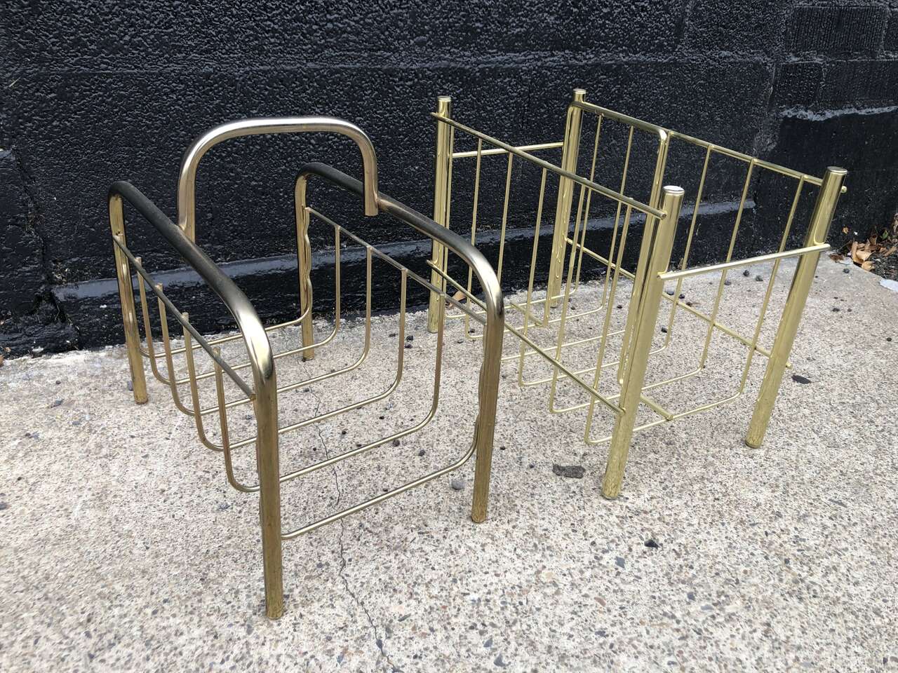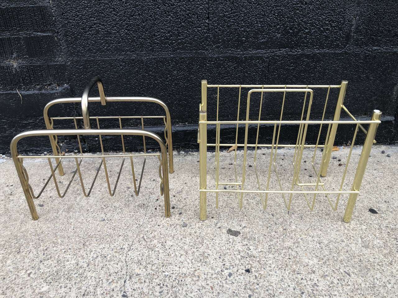 Super cool vintage mid centuey modern magazine racks. $25 each. Approx dims roundEd corner rack: 13"w x 7.5"d x 12"t. Rectangular rack: 14.5"w x 8"d x 12"tall