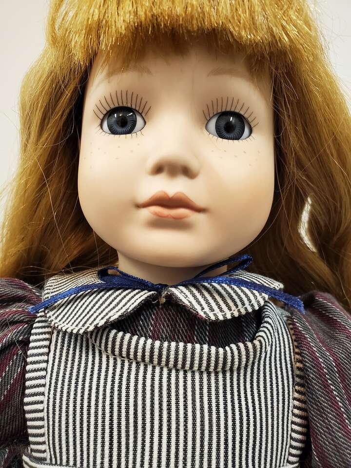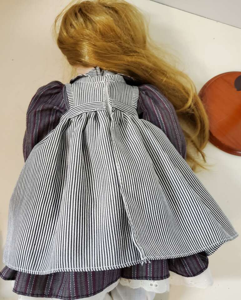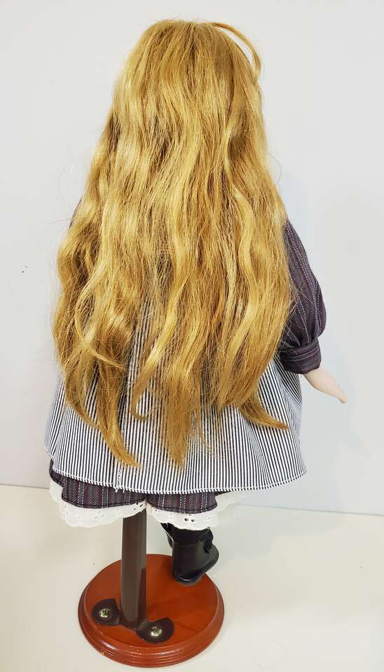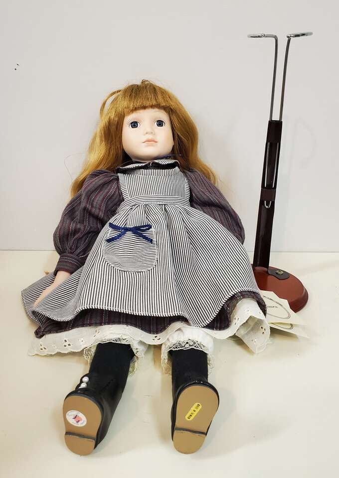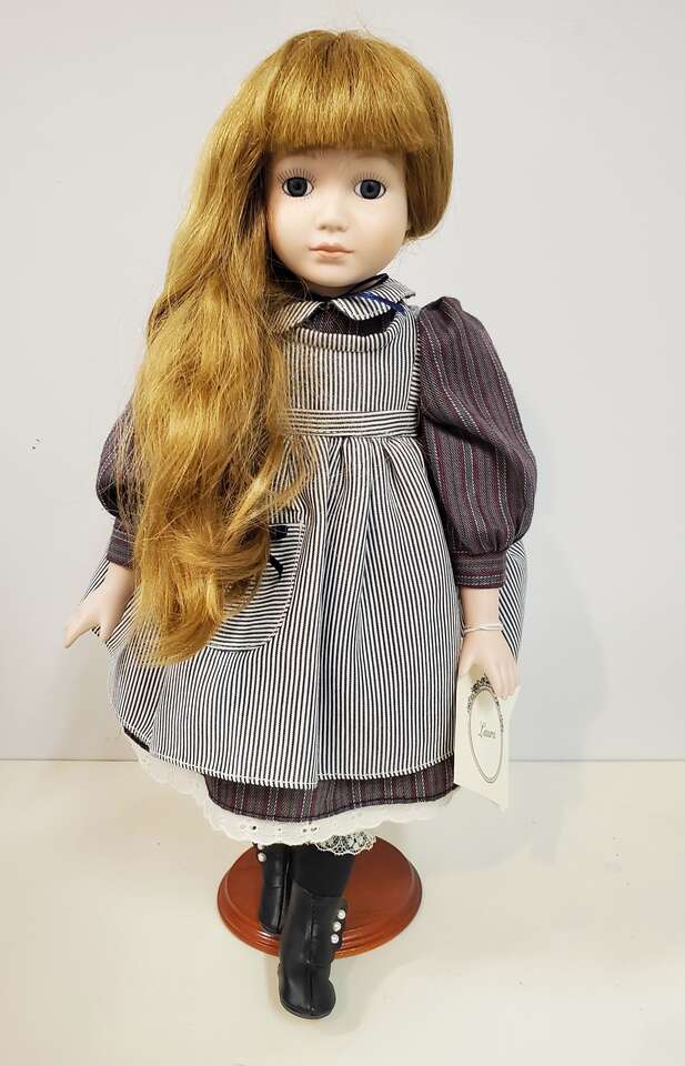 Tender Hearts "Laura" Porcelain Doll From Treasures LTD.. This sweet little girl stands about 16" tall with blue eyes and auburn hair wearing a striped pinafore. Still has tag on arm. Cash Only. No Codes
