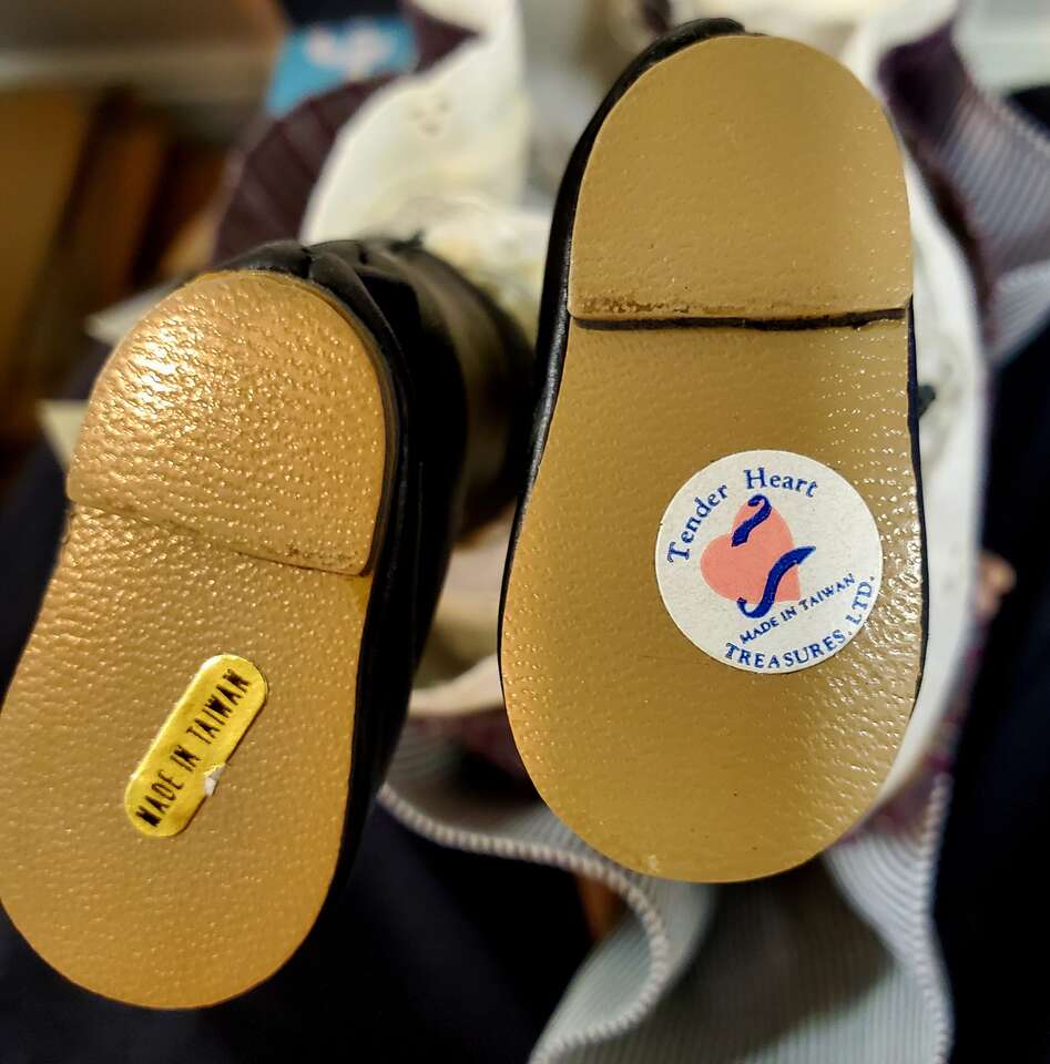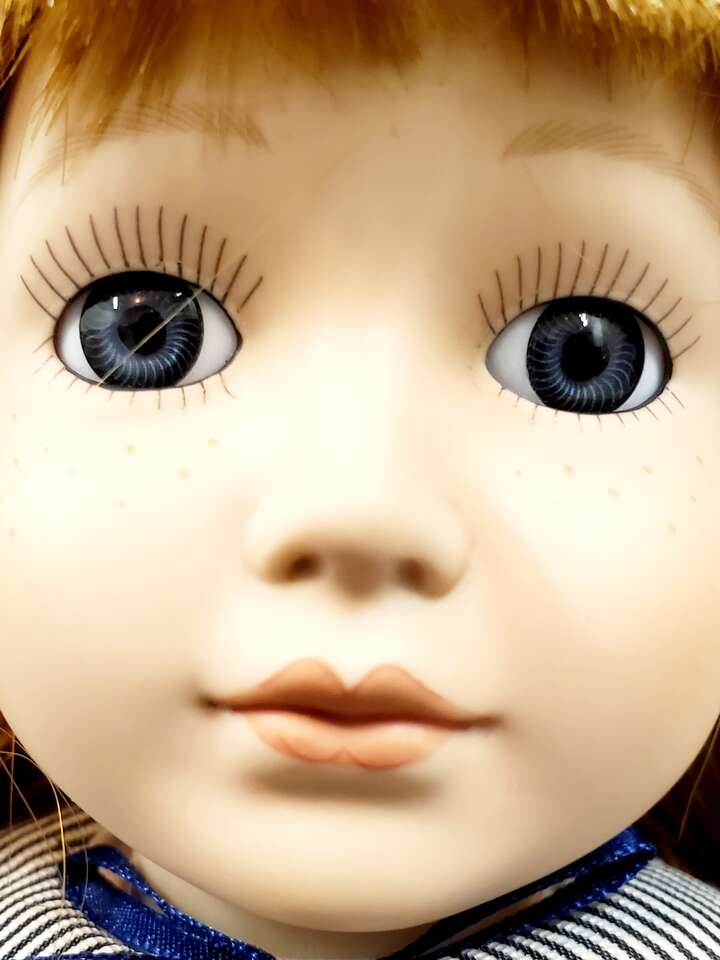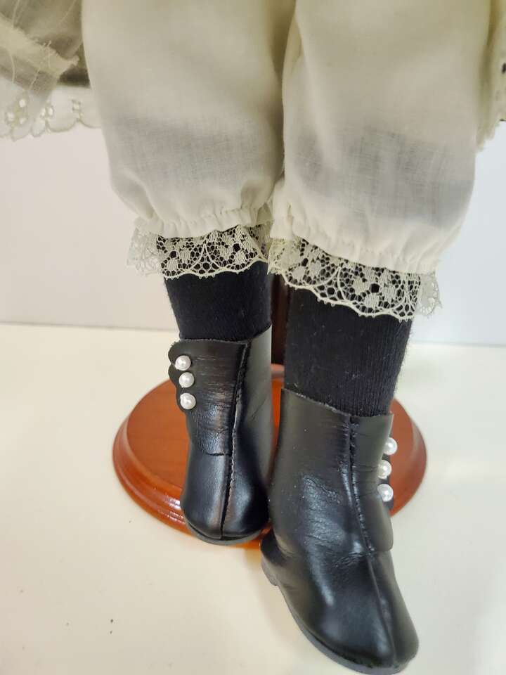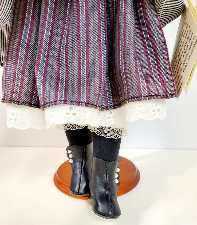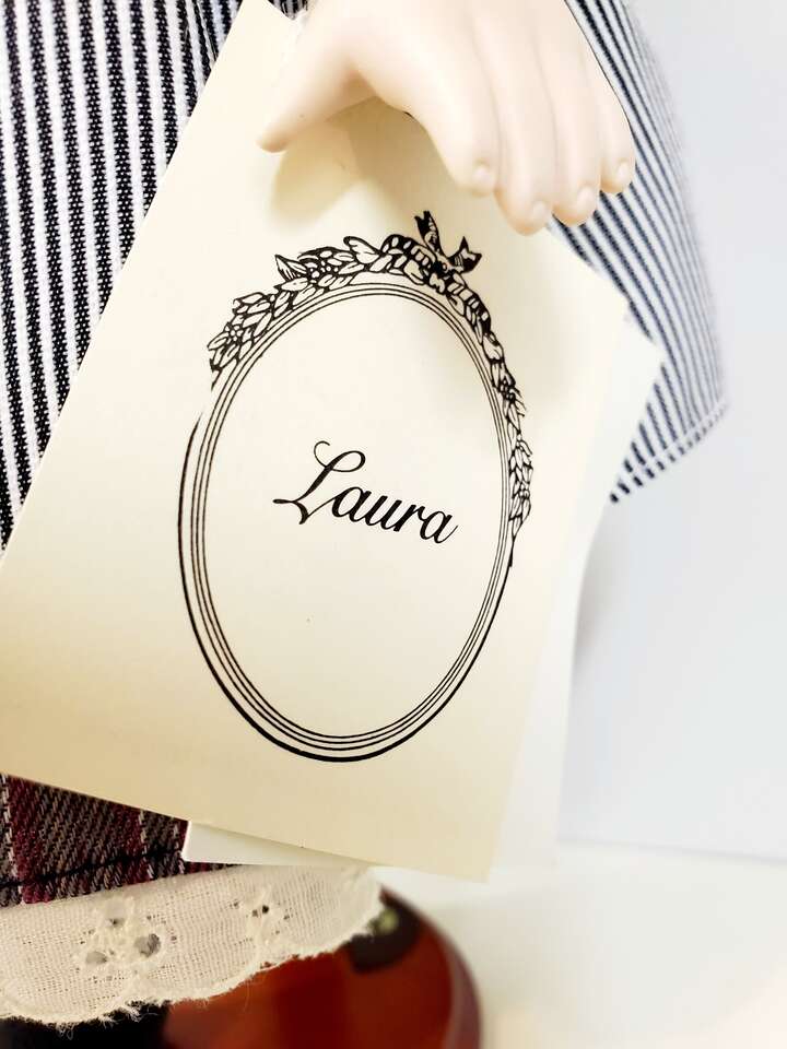 Tender Hearts "Laura" Porcelain Doll From Treasures LTD.. This sweet little girl stands about 16" tall with blue eyes and auburn hair wearing a striped pinafore. Still has tag on arm. Cash Only. No Codes