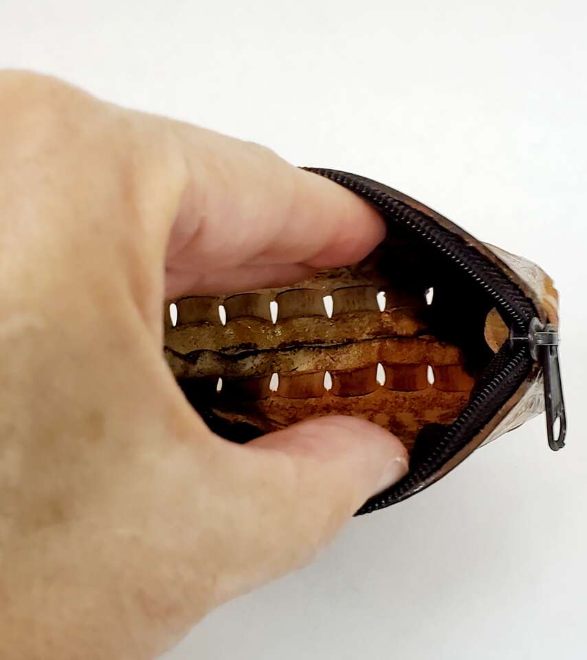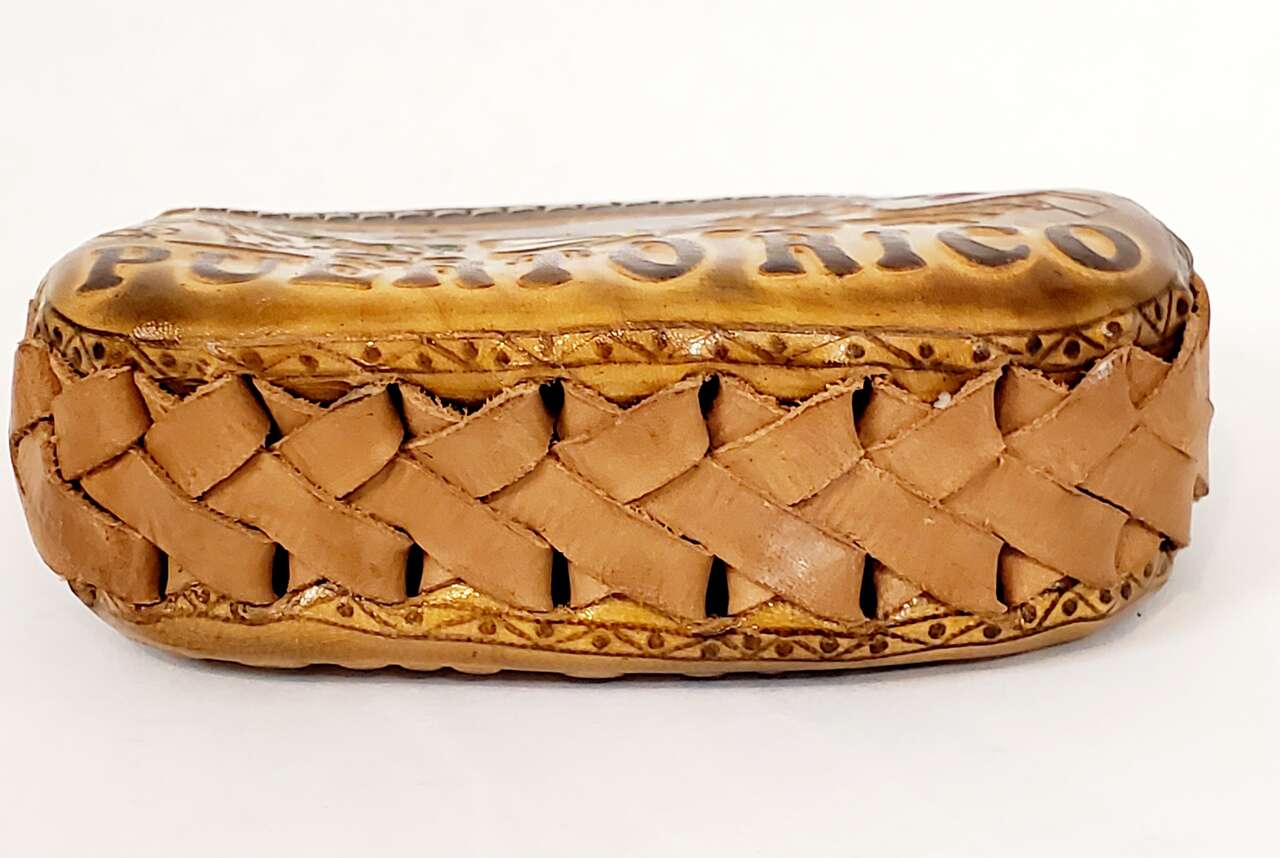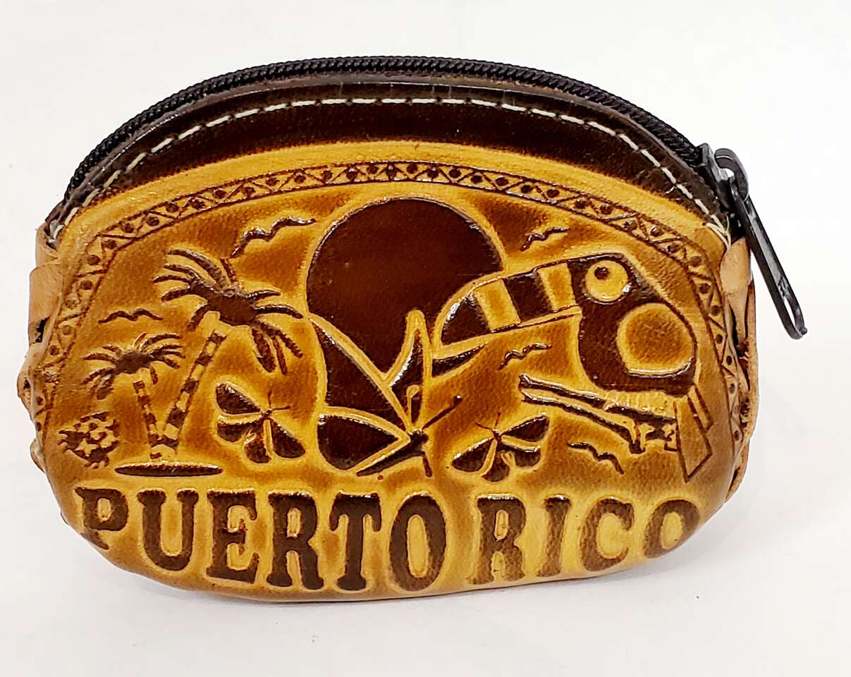 Vintage Tooled Leather. Colorful Small Accessory Card, Money Holder, Braided, Zippered Change Purse Souvenir of Puerto Rico. Toucan, Palm Trees Butterflies. Cash Only, No Codes.