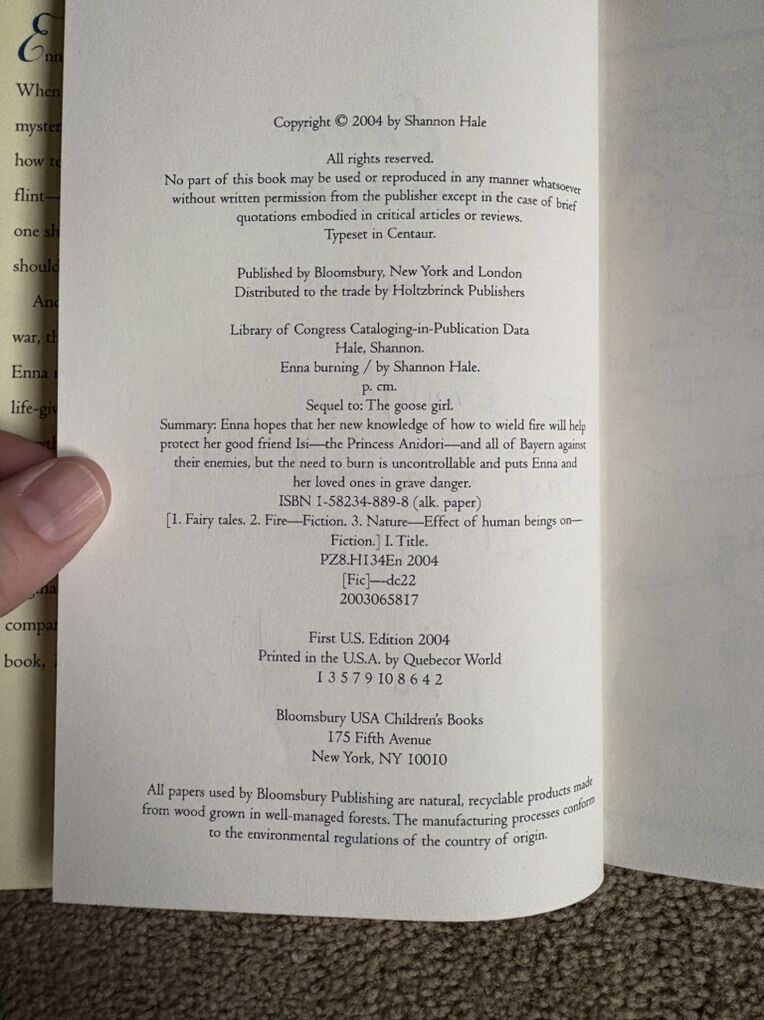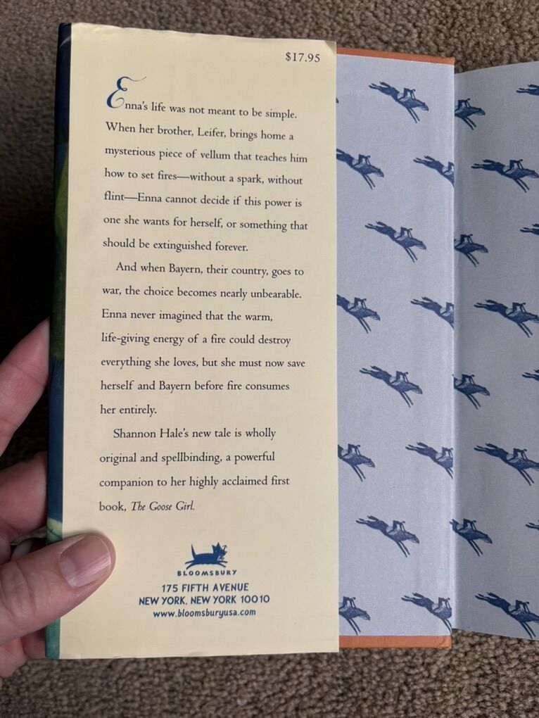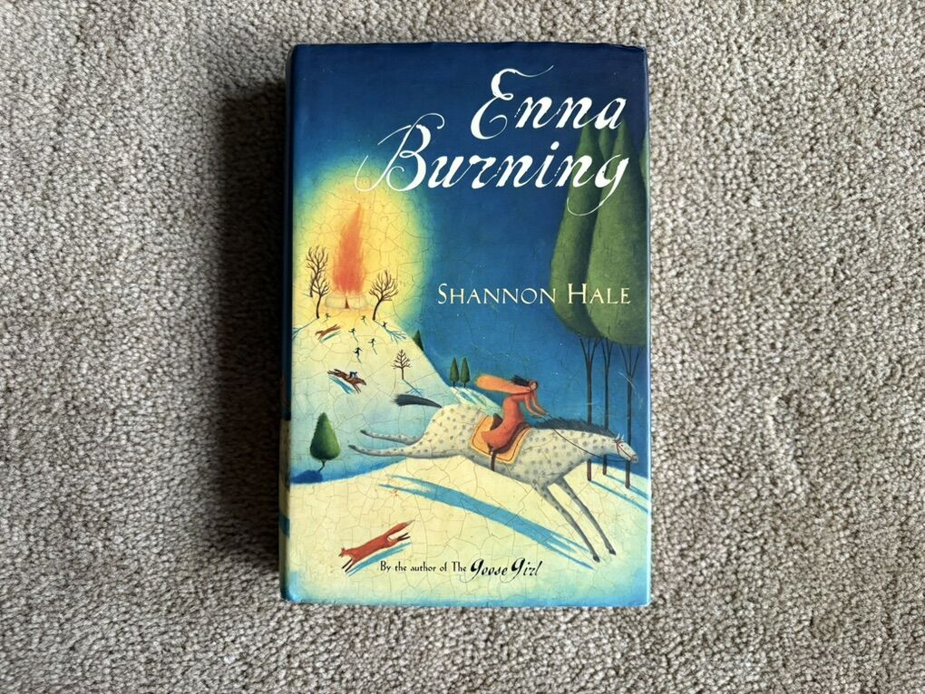 Enna Burning, by Shannon Hale. Book 2 in The Books of Bayern series. Hard to find edition. First edition hardcover, published 2004, 317 pages. Very good condition, including dust jacket (slight wear on corners--see photos). Signed by the author on title page, with inscription (see photos). Text only. Cash or Venmo.