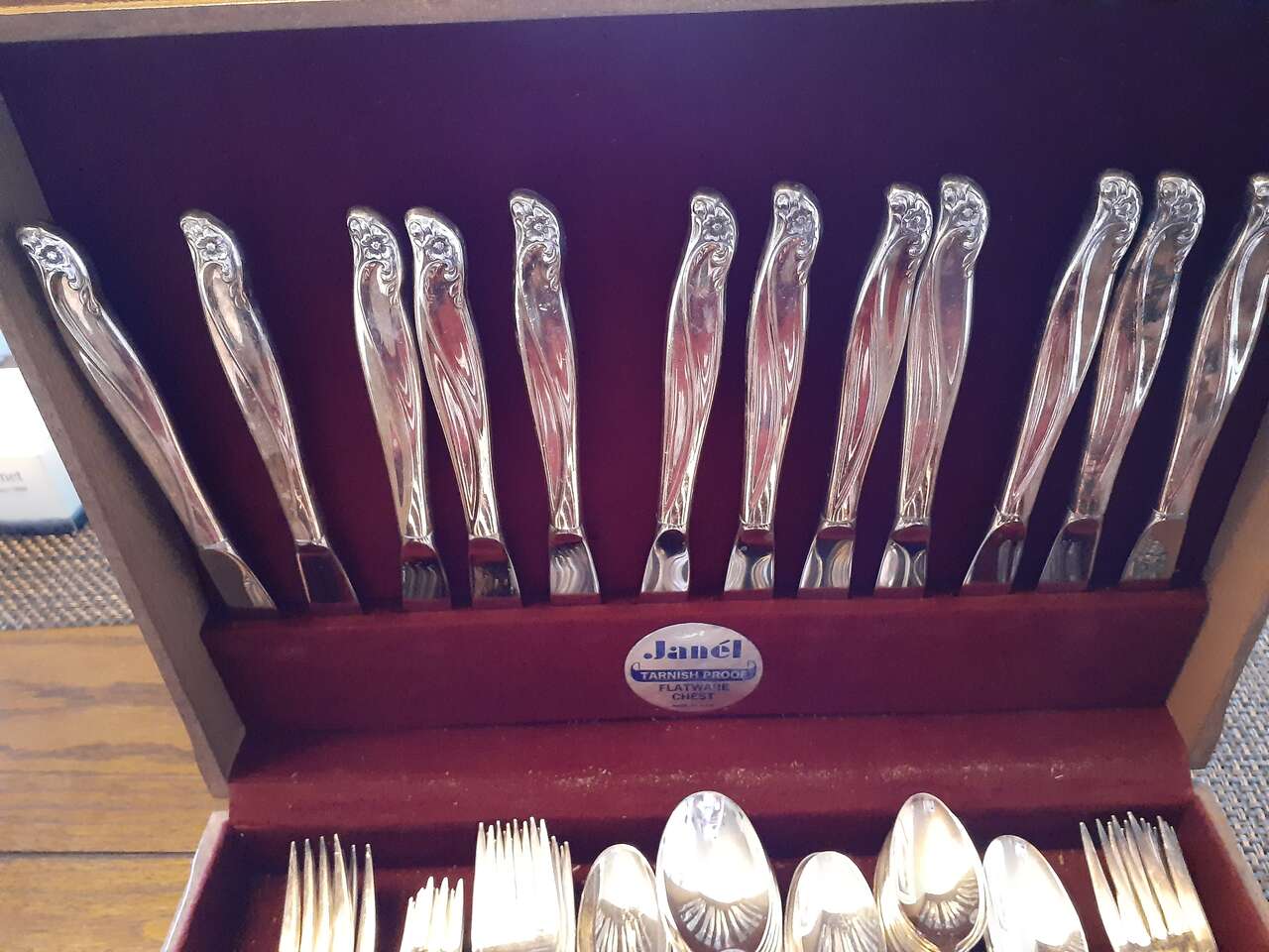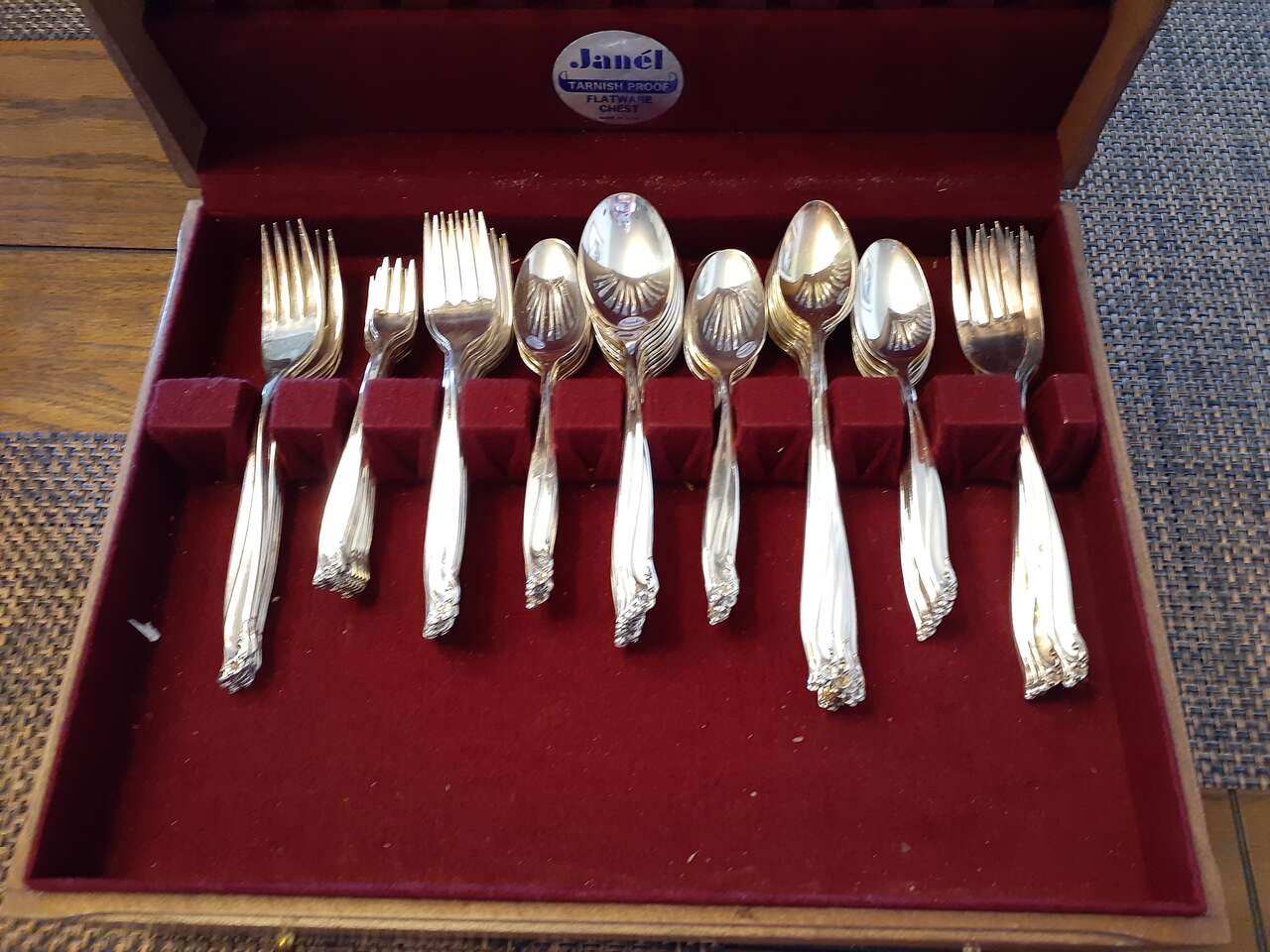 96 piece flatware with 8 piece serving set in wooden case. Very beautiful when polished. I accept Venmo or cash on pickup. Asking $520 or best offer